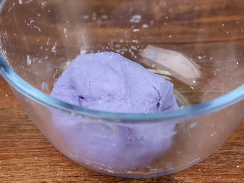 蝶豆兰汁加入150g木薯淀粉及烫熟木薯团揉制均匀,揉制均匀的六色面团完成