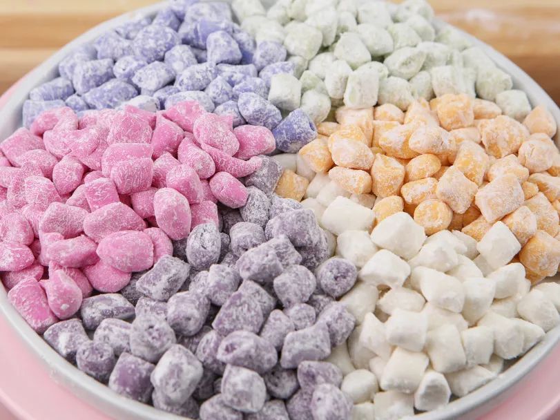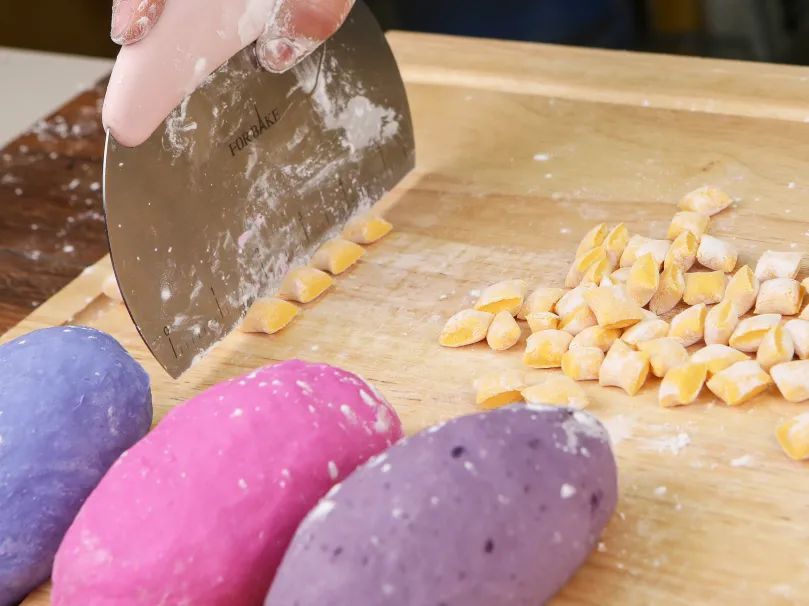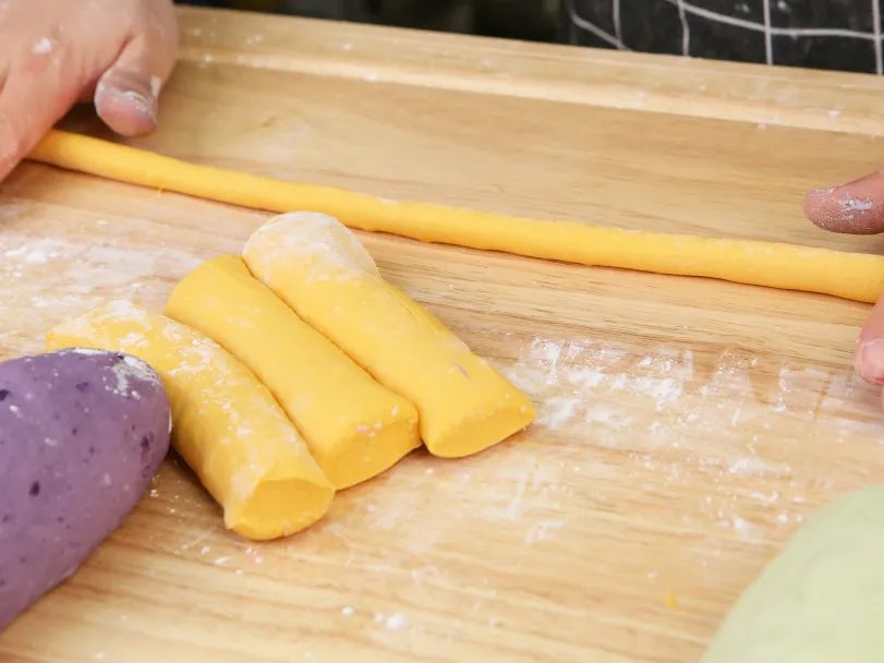依次将不同口味的面团搓条切块,并撒上手粉防粘