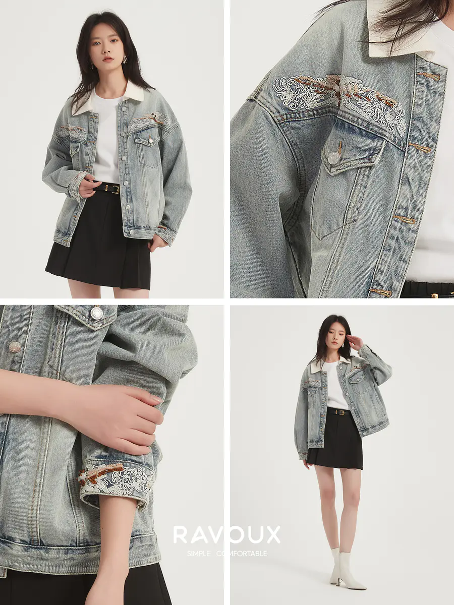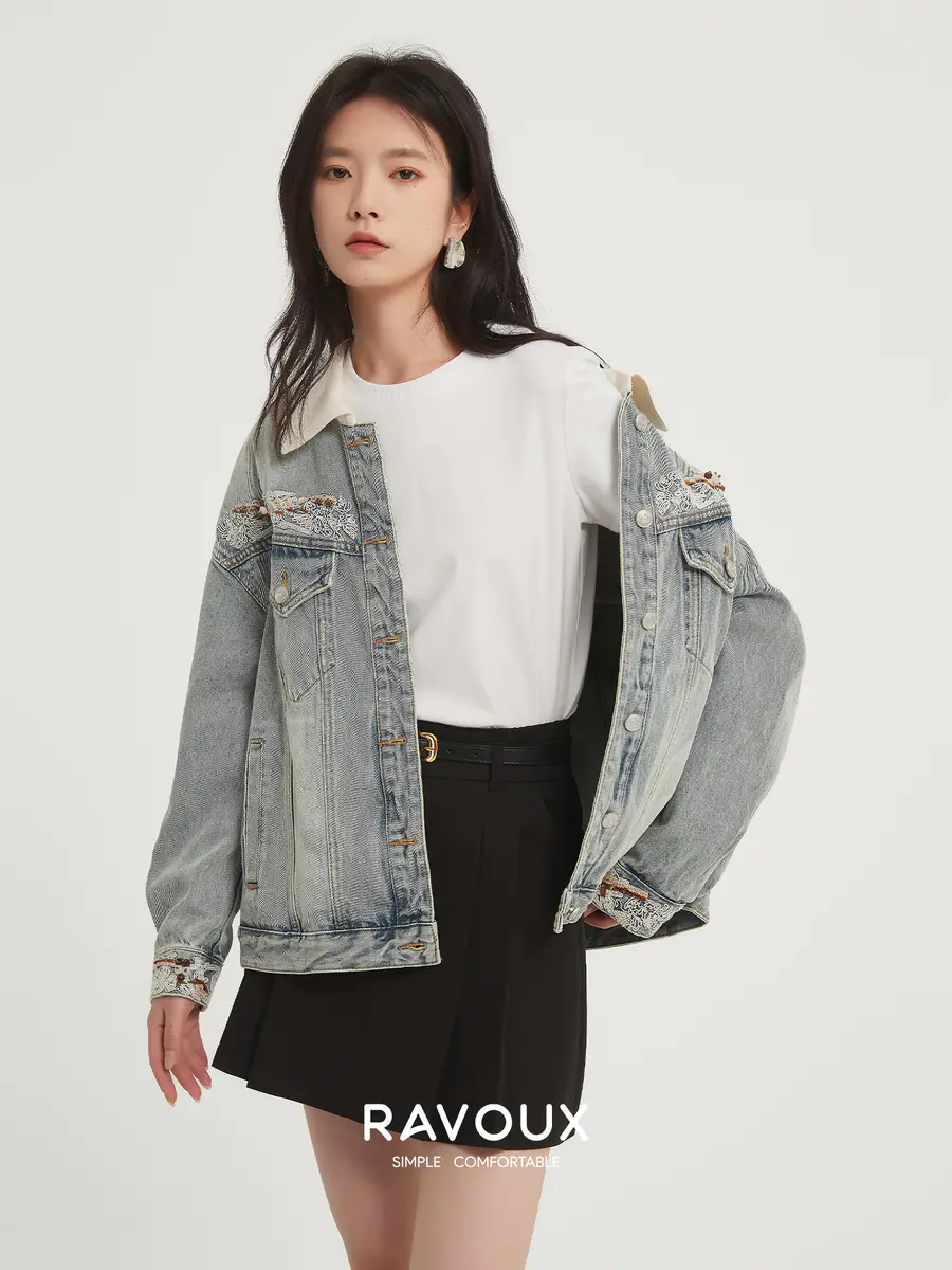 浅丹宁蓝与白色翻领撞色巧妙结合