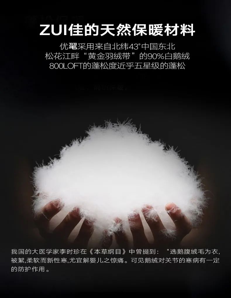 ps:相同重量的鹅绒,“黄金羽绒带”上的鹅绒能够更蓬松,达到更保暖,更舒适的效果,与国外高档羽绒服的原材料基本一致哦。