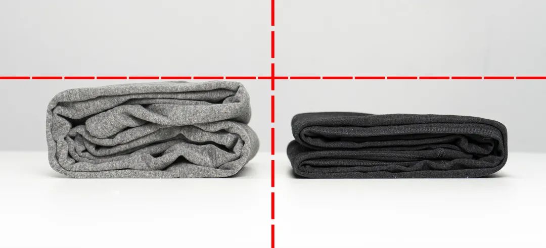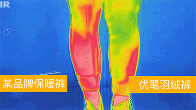 可以看到和加绒保暖裤比,羽绒裤更能牢牢裹住热度。一脱裤子,优毣羽绒保暖裤的颜色(热量)也比普通加绒保暖裤更红!更亮!