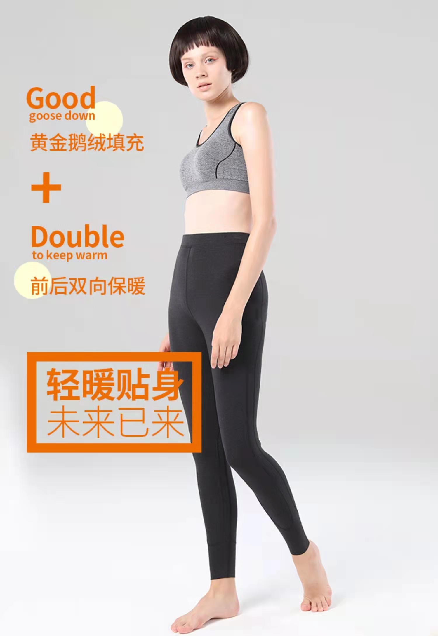 左边套上加绒保暖裤,右边套上优毣羽绒保暖裤。