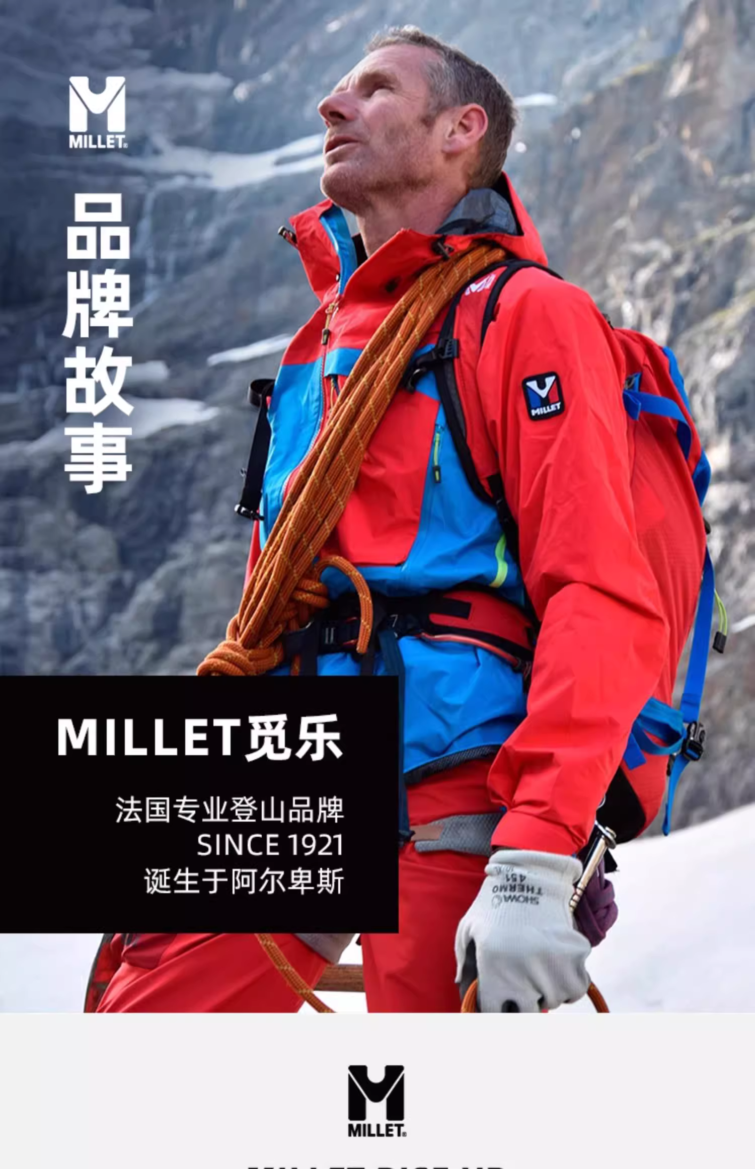 从阿尔卑斯群山中走出,百年来不断打破陈规,勇于创新,融合了法国的时尚设计灵感和欧洲设计的杰出工艺,MILLET觅乐品牌已经全面覆盖了山地运动的全年需求。至今为止,MILLET 觅乐产品已经布局达全球30多个国家和地区,为户外爱好者提供了更多的支持。