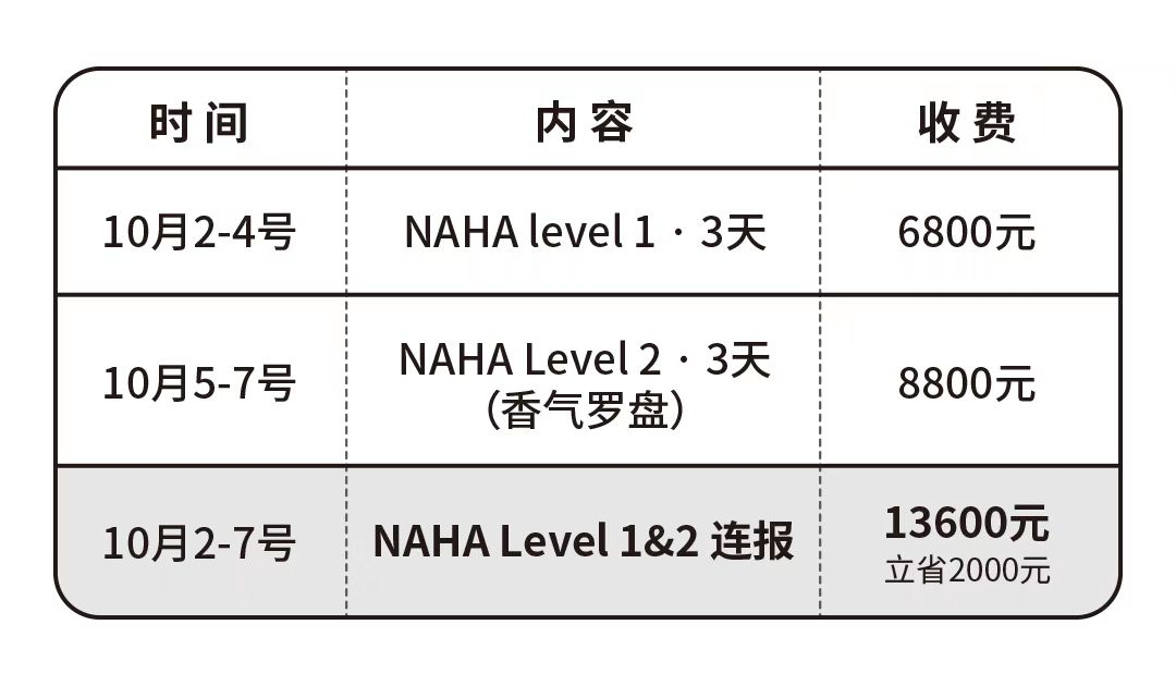 芳研社NAHA课程的第一个特点就是内容非常丰富(点我了解详细课程内容)。比较现有的多家NAHA课之后,我们发现芳研社NAHA课一阶的水平,实际上等于别人1+2阶的内容。