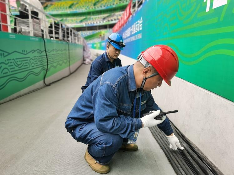 国网西安供电公司保电人员对十四运会主舞台侧边防爆沟的电缆敷设进行检查