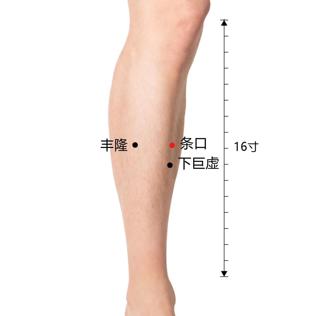 从腿的外侧找到膝眼和外踝这两个点,连成一条线,然后取这条线的中点,再找到腿上的胫骨,胫骨前缘外侧1.5寸(大约是两指的宽度)