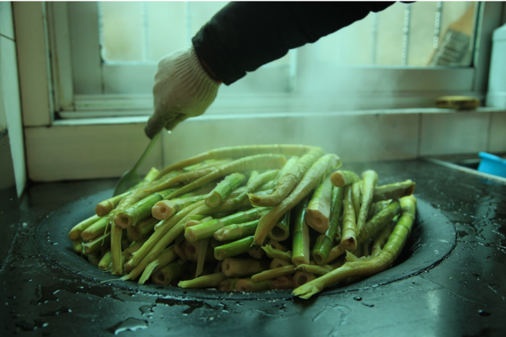 剥好的笋,放在大锅笼屉上,洒上少量食盐,鲜笋和盐的比例是25:1,加入山泉水,用松木柴火烧煮。