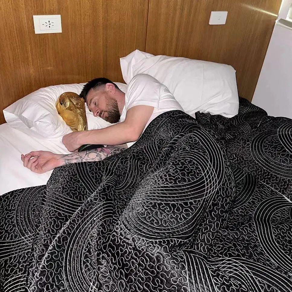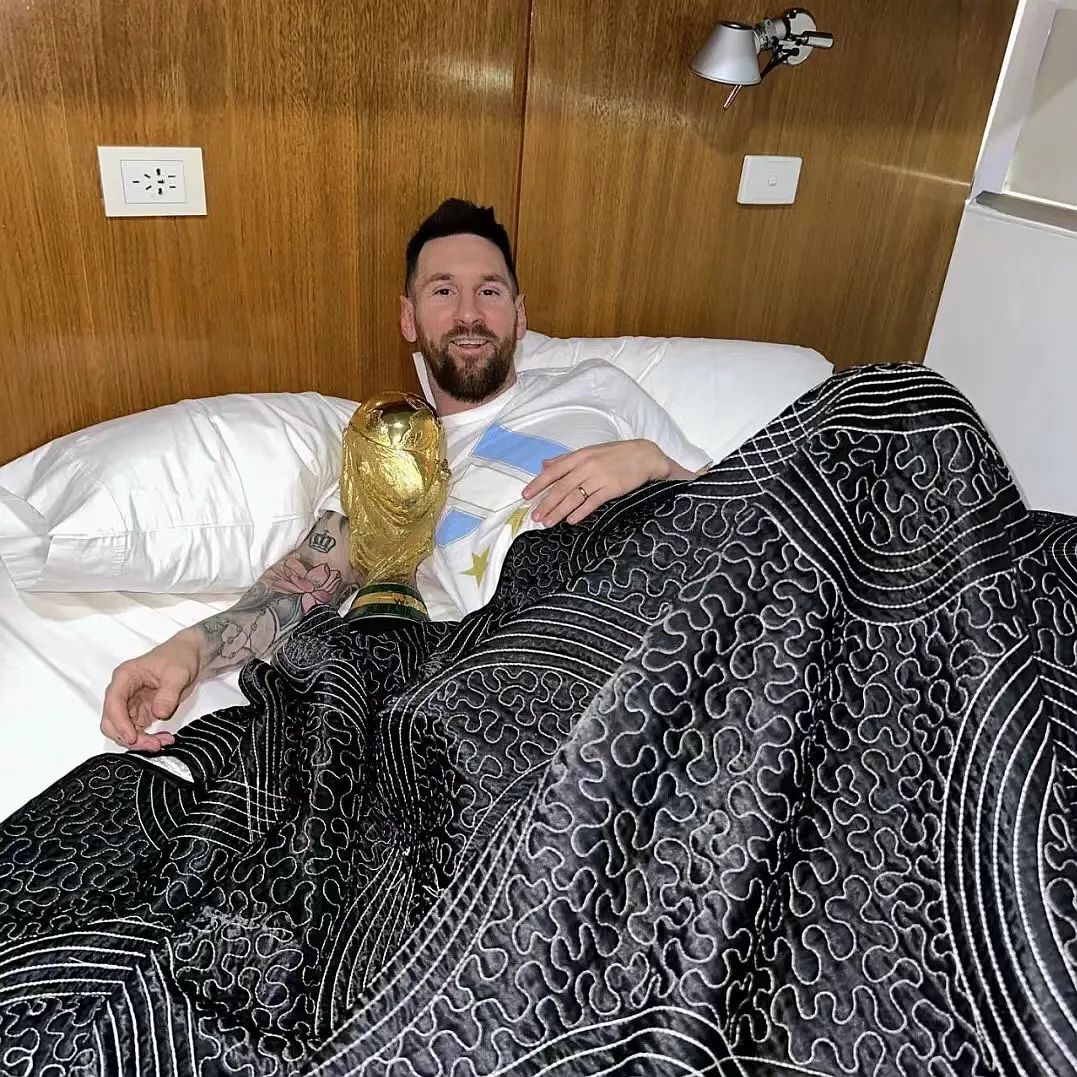 是的,你没有看错。只有梅西才够格把大力神杯当做床上抱偶