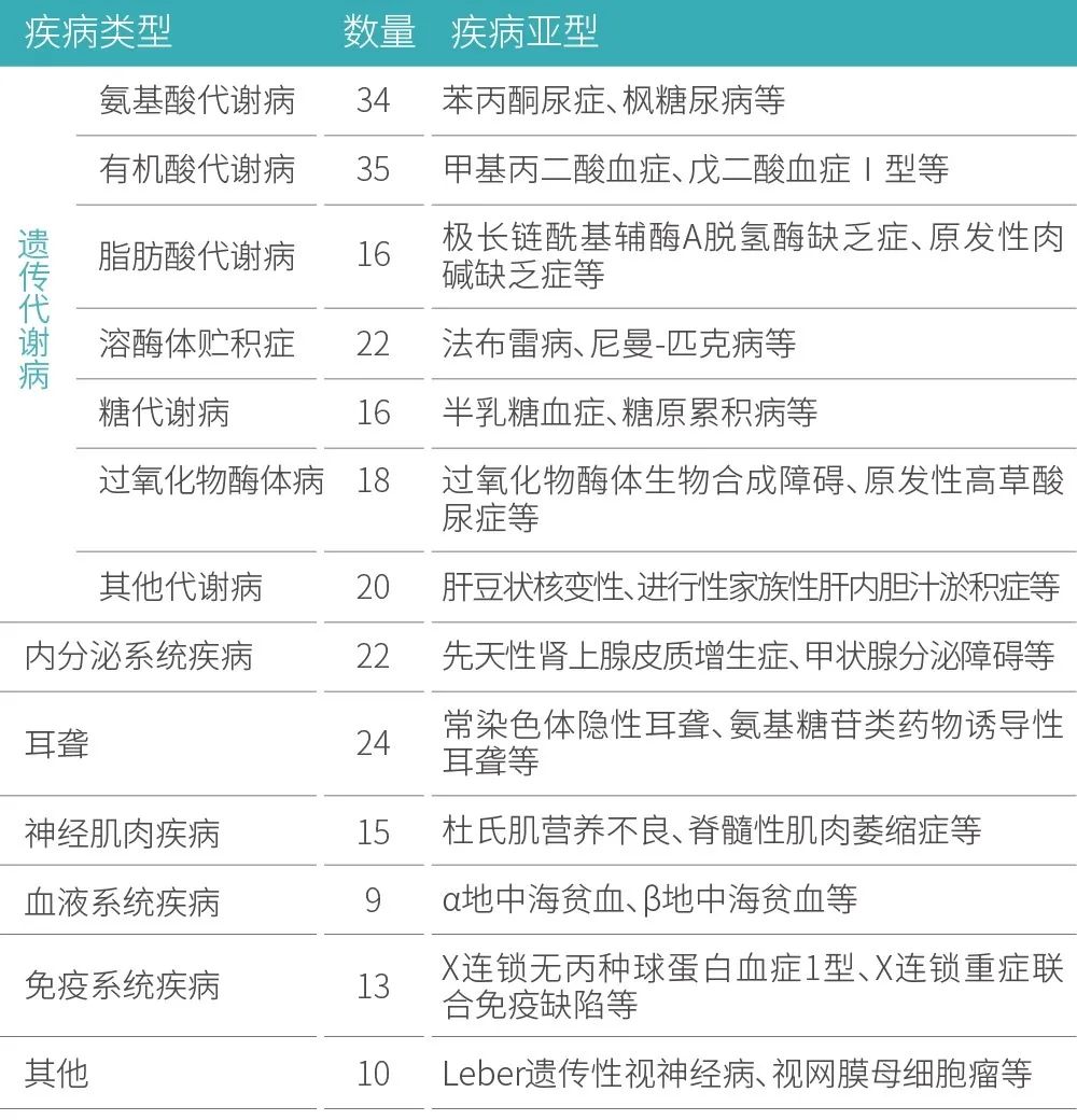 本次升级后的检测疾病涵盖了常见遗传代谢病、遗传性耳聋、地中海贫血、杜氏肌营养不良症 (DMD)、脊髓性肌肉萎缩症 (SMA) 等,不仅可针对普通新生儿群体进行筛查,及早发现疾病,还可以针对临床疑似患者进行对症解读分析,辅助疾病快速诊断,满足临床的筛诊需求。