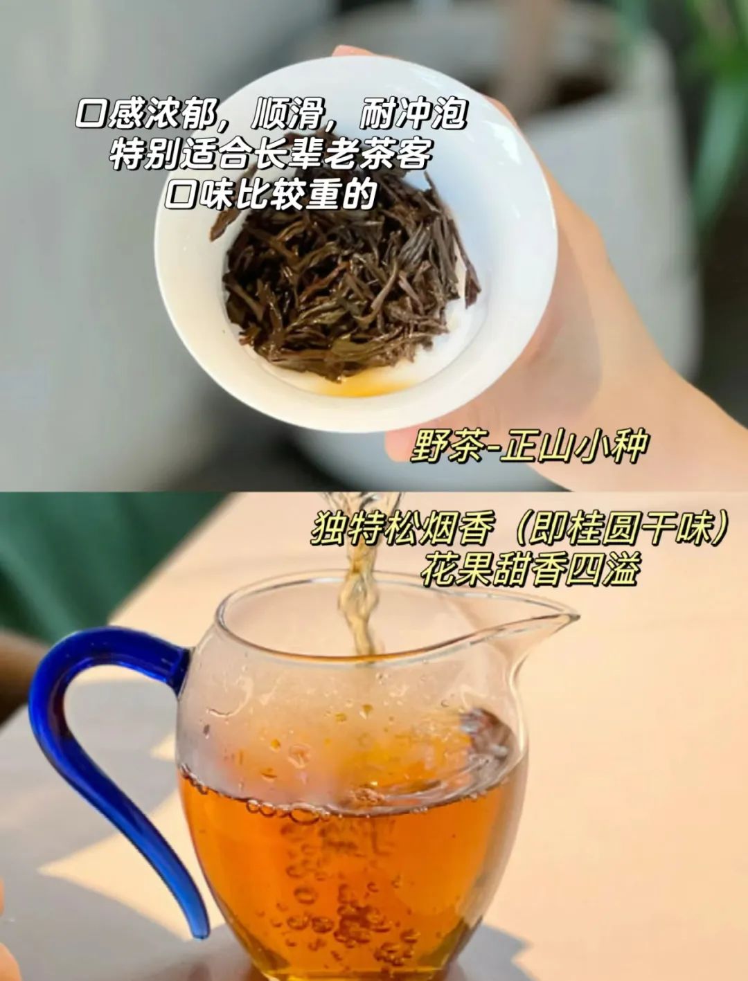 有一种来自时间的沧桑感扑面而来,潮湿、温润、清甜,仿佛走进山林深处,缓慢熏制的松香经久不散,冲泡多次仍然韵味十足。