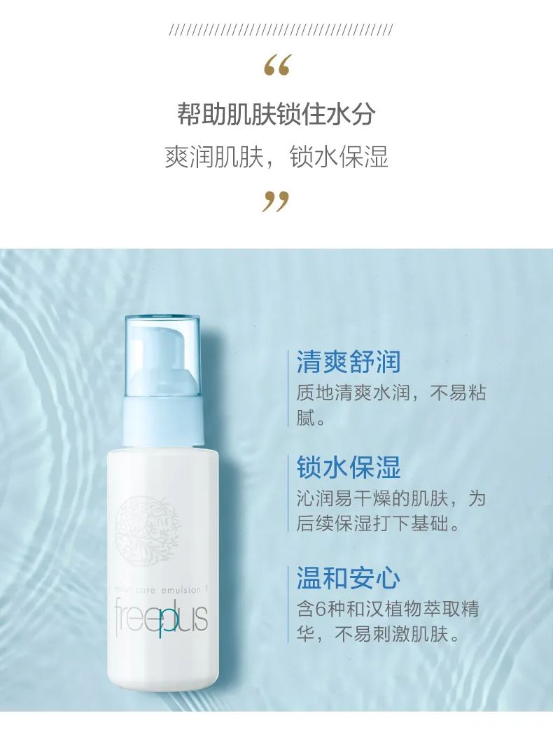 主打温和无刺激,敏感肌适用!透明的水漾质地快速吸收,能够在夏日迅速补充水分,多种植物萃取精华以及烟酸B给肌肤补水的同时调节肌肤的健康状态,尤其在肌肤不适或晒后湿敷几分钟肌肤会立马得到舒缓。