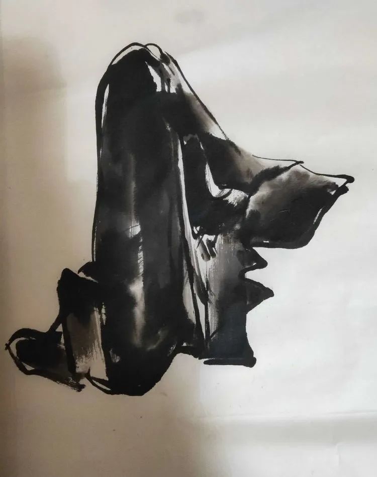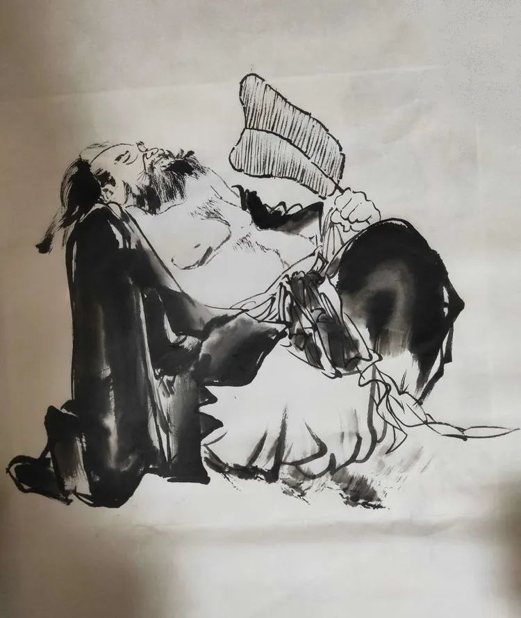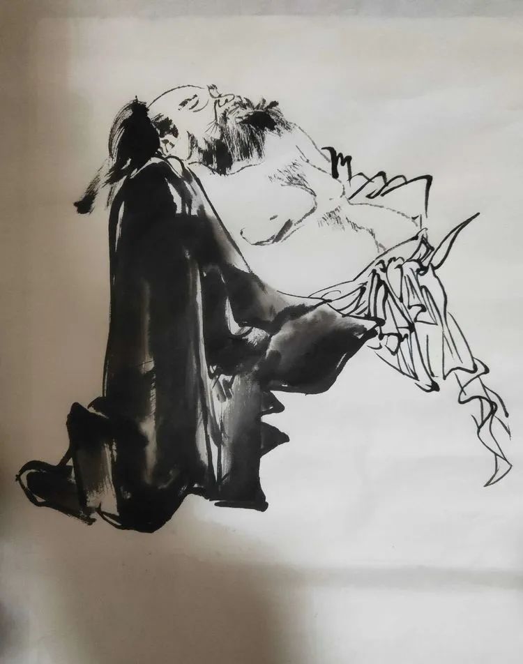 第六步:用淡墨勾写左手,浓墨勾写竹扇。用重墨一笔写出左腿,淡墨数笔写出右腿。