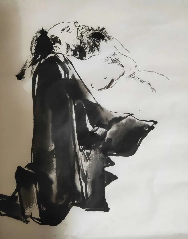 第四步:写出人物头部和腹部,除头发眉毛外,细笔勾写,而头发眉毛枯笔快写且一气呵成。