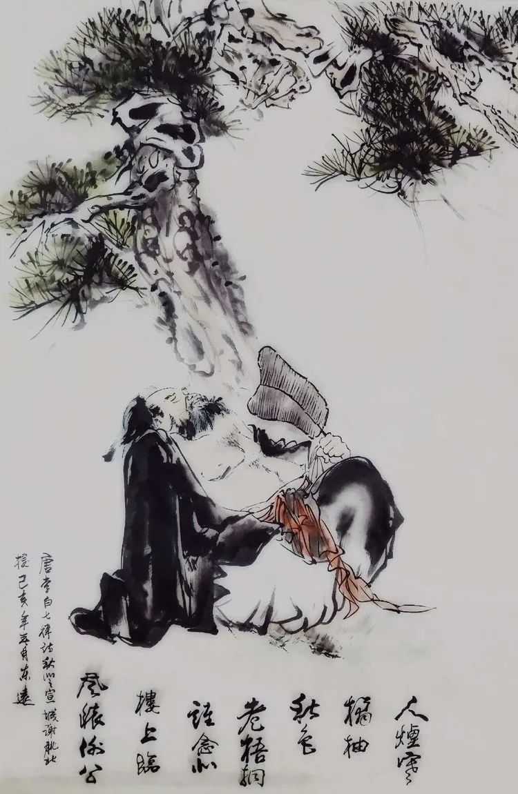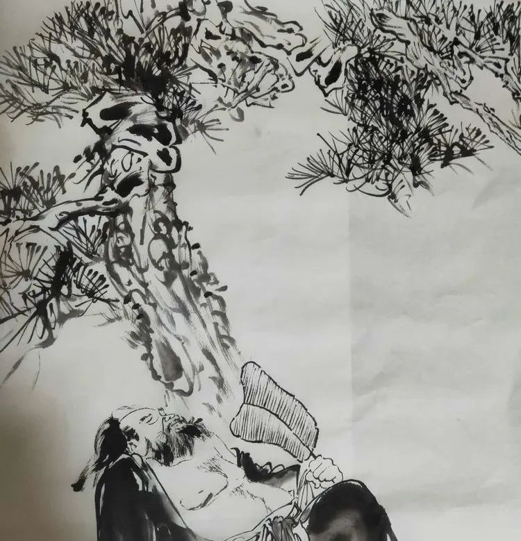 大写意人物画既能体现出国画的韵味和魅力,也能体现出画家的文化底蕴和天马行空的艺术创造力。《临风怀公》描绘古代高士风情的人物画,清淡的底色,渲染出了古典气韵,高大的松树,古朴苍老的树干。在这古老松树下面,一位狂放不羁的老者手执一把方圆竹扇正在临松翘首远望,画中树人合一,表达造化自然。画中运用的虽然是大写意的手法,但依然清晰地勾勒出了老人的衣裤,线条流畅而古朴,老者翘首以望的是自己的希望吧,眼中流露出的神情是如此自信,姿态是如此潇洒随意,这幅图把那种“古韵”表达得恰到好处。