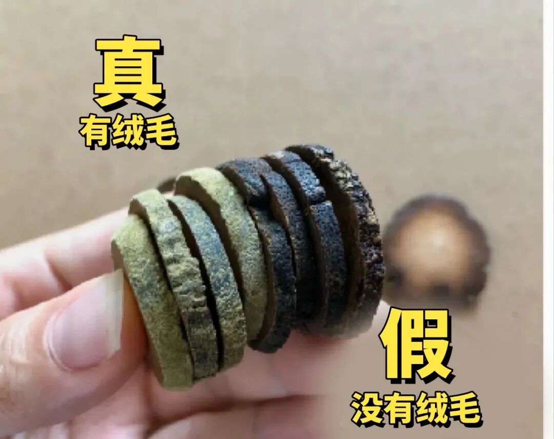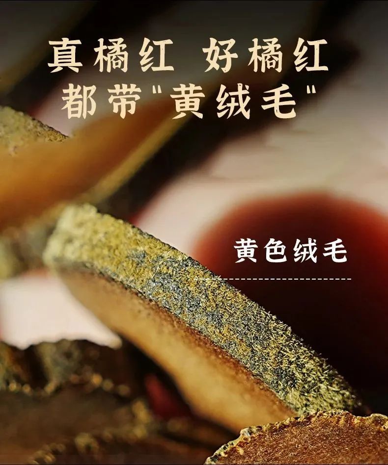 正宗的化橘红切片,外圈有一层金黄绒毛(所以被叫正毛橘红),这也意味着品质更好。