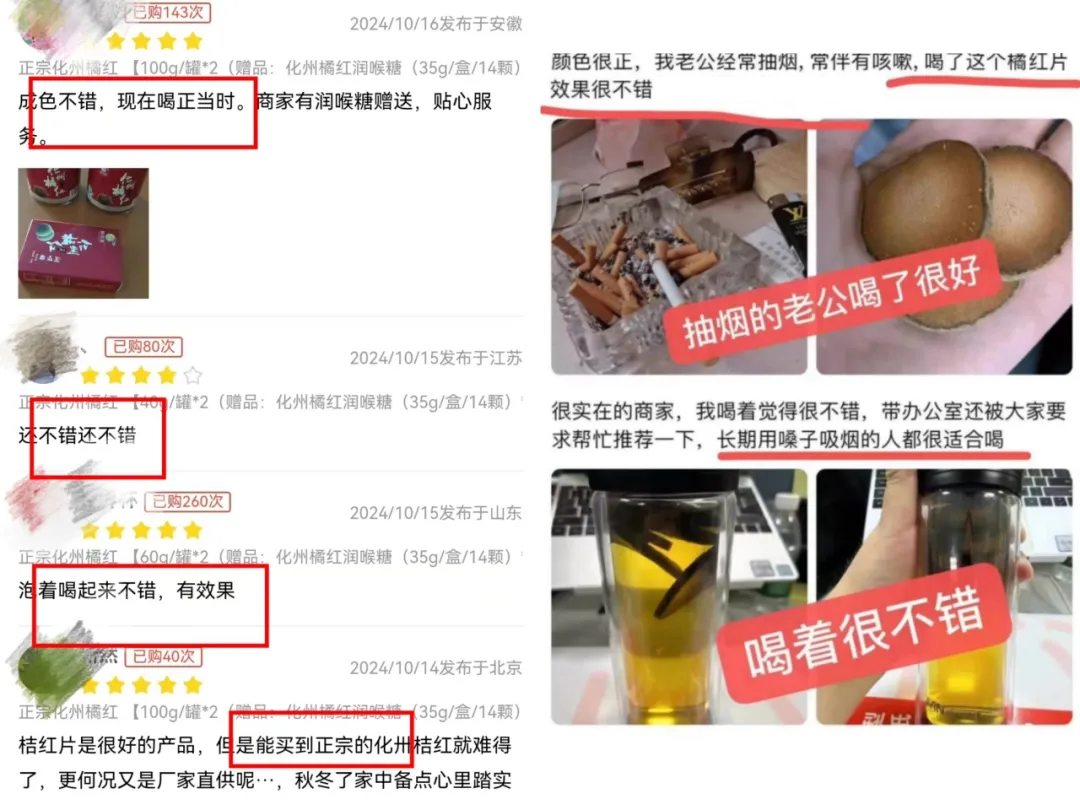 不熏染不染色,SGS检测308项农残0检出,每一罐化橘红片都符合行业标准!放心下单,家人喝得安心!一片精品化橘红切片,凝聚了化州祖祖辈辈经验,历经5年以上光阴,难怪一片值千金!买一罐少一罐!可遇不可求!阴冷燥邪,如果你经常熬夜吃辛辣、抽烟喝酒应酬,还身处入雾霾大、天气干燥的地方,赶紧泡一壶有机橘红,喉咙舒坦~暖爸都表示要我多囤几罐,这个包装送领导、送朋友也特好~有机化橘红一罐100g,一片可以反复冲泡多吃,泡杯它比10盅冰糖雪梨管用!单泡橘红喝是有点苦涩的,可以选择加点红茶或者其他等,冲泡各种茶饮。呼吸热病科的王琦主任提醒:痰是津液运行过程中的产生的废弃物,中医专家常用的方子,就是二陈汤。喝过的朋友也纷纷好评: