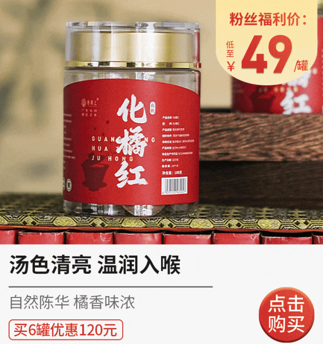 除了是地理标志产品,还是“中国四大南药”、“十大广药”之一,明清时代被列为贡品。暖暖亲自前往化橘红产地,亲眼看到了整个化橘红的种植、生产,暖粉可以放心!喝法很简单!拿一片用沸水冲泡,就会有一股清新自然柑橘香扑鼻而来,鼻塞的开关好像都被打开了!本来之前我感冒嗓子老是干痒咳嗽,连喝了一阵,就感觉像换了一个嗓子!抽烟的暖爸爸更是瞬间爱上,现在每天保温杯里泡一片不离手!尤其适合经常用嗓子、抽烟喝酒、常年受咳嗽多痰困扰的朋友。现在活动价,1罐只要69元!(有60-80片,每天泡一片,能喝两个多月!一天花一元就能拥有好嗓子啦)