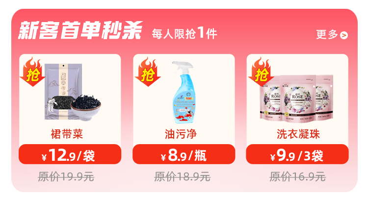 现在新客下单抢秒杀商品(每人限抢1件),享首单秒杀价!食品、日用品多种商品任选,点击下方图片开抢↓