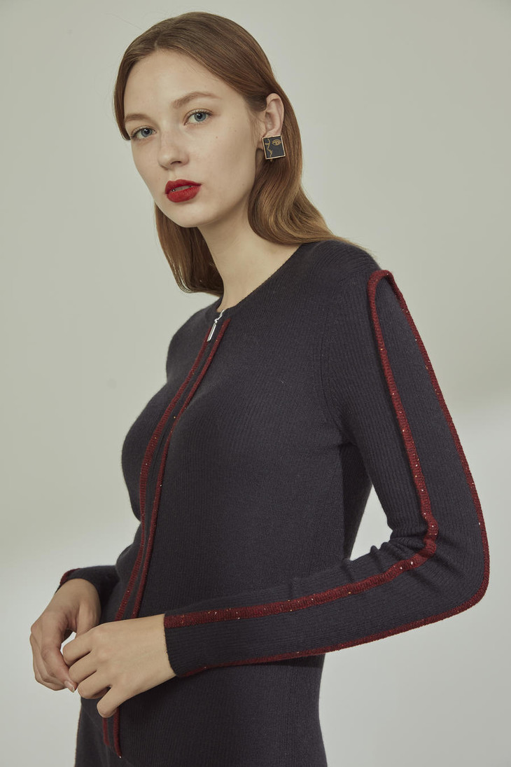 Sandriver 秋冬精纺羊绒圆领抽条修身女拉链衫