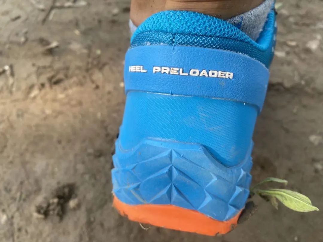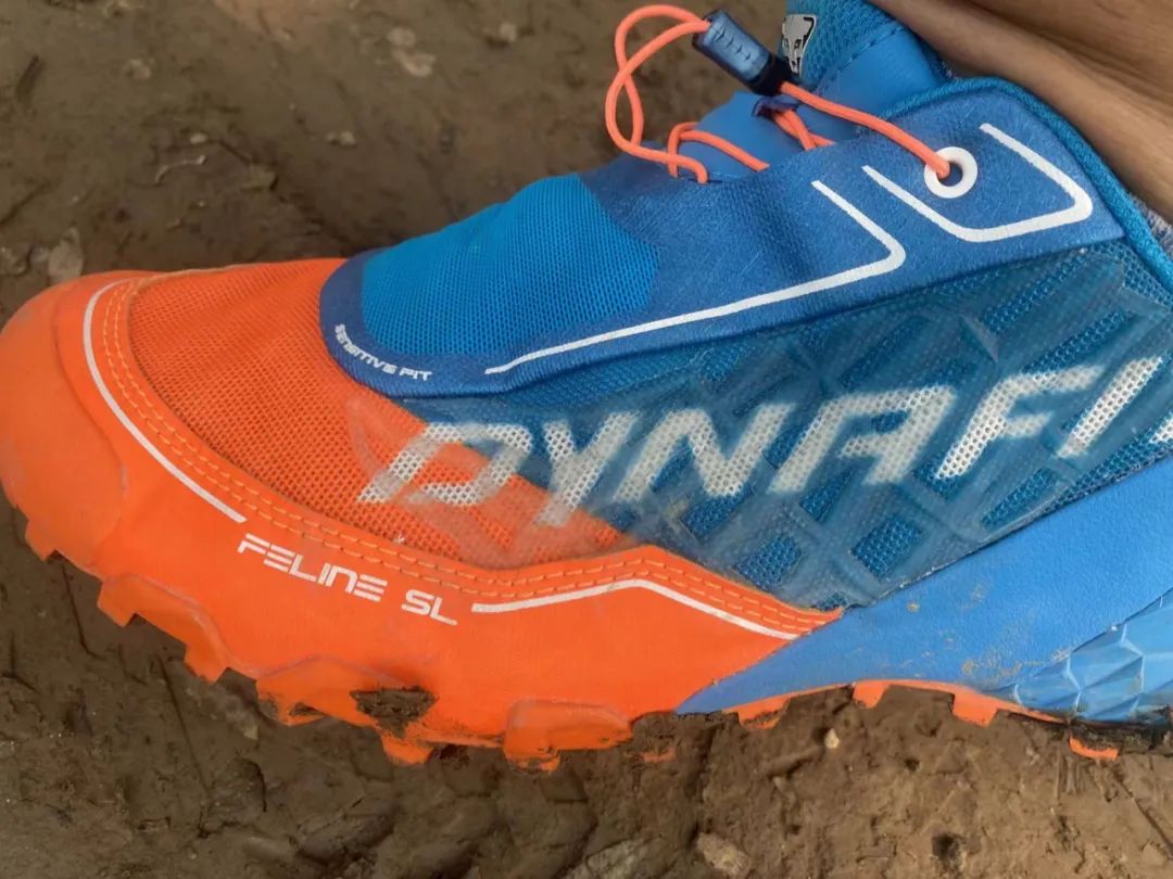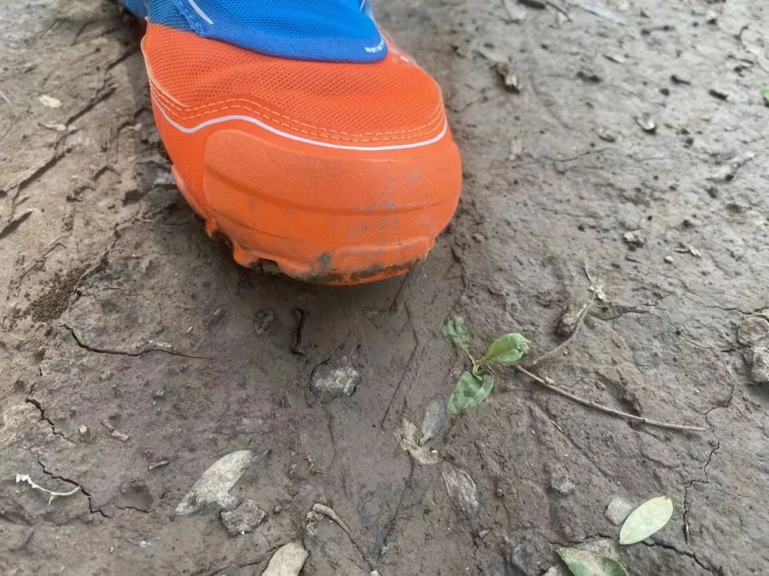 而在砾石路面路感特别清晰,甚至有些硌脚, Feline SL的前脚掌中底被包裹在防撞橡胶头里,防止传统三明治式的越野跑鞋鞋头开胶的情况。