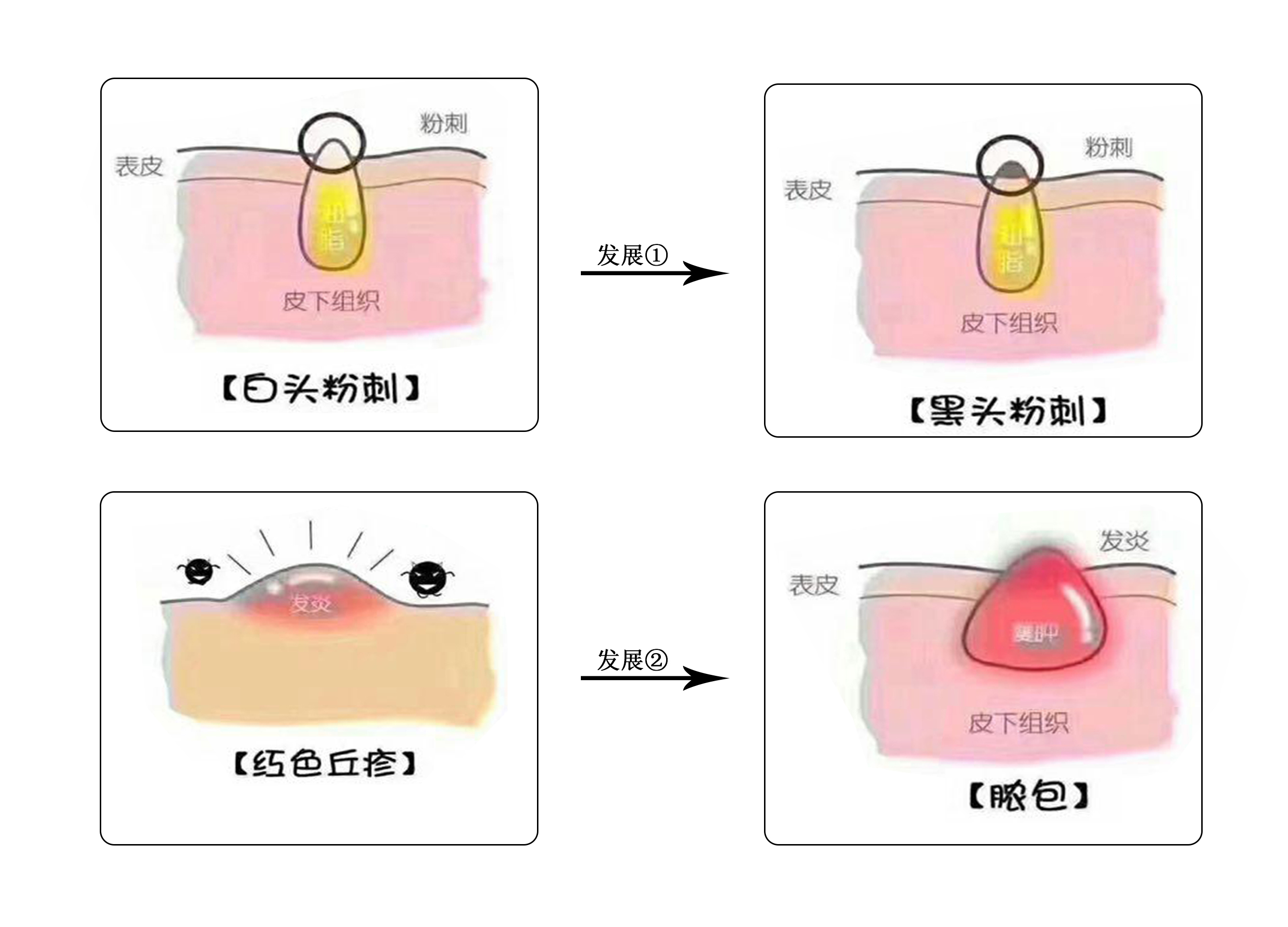角质层堆积 → 油脂堵塞在毛孔里 → 久而久之,感染细菌后,变成痘痘