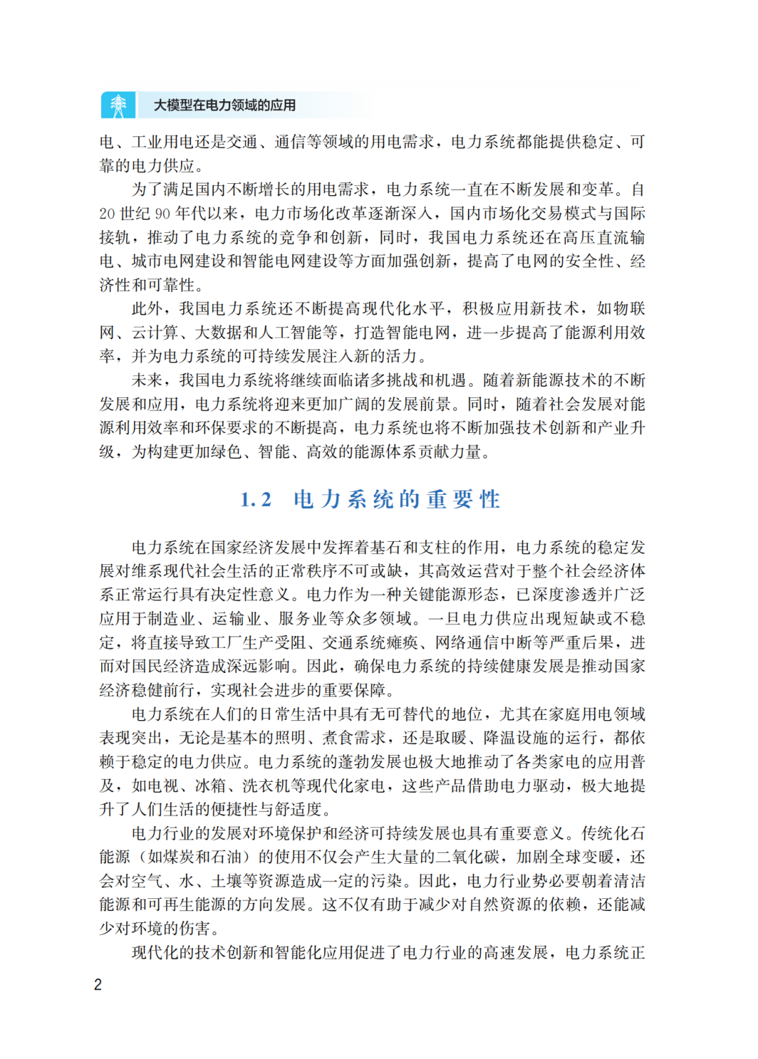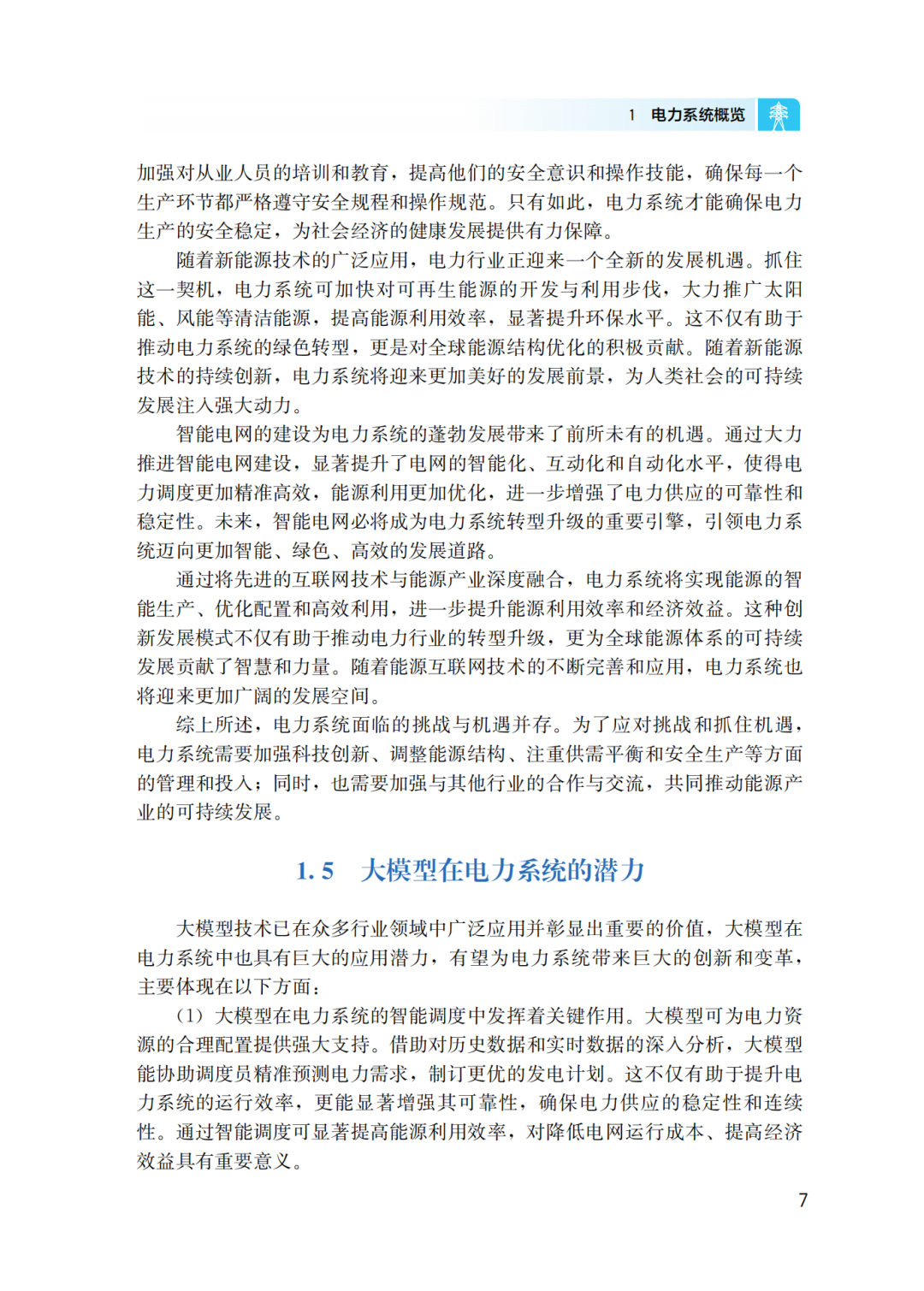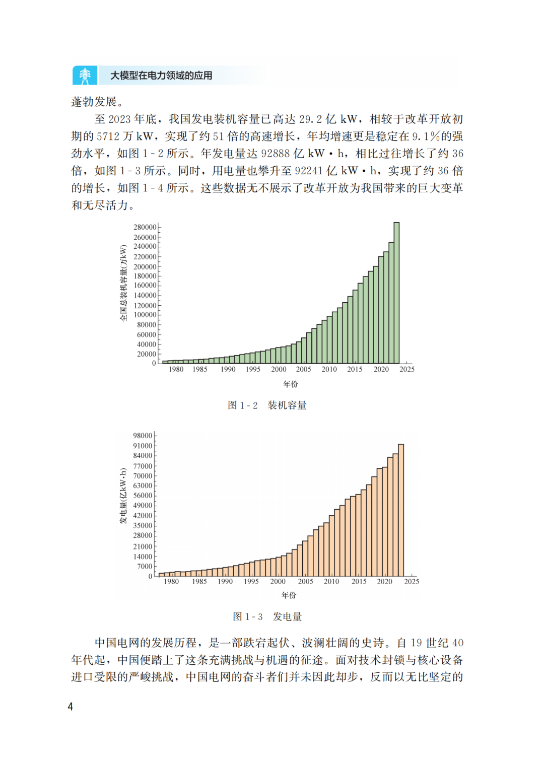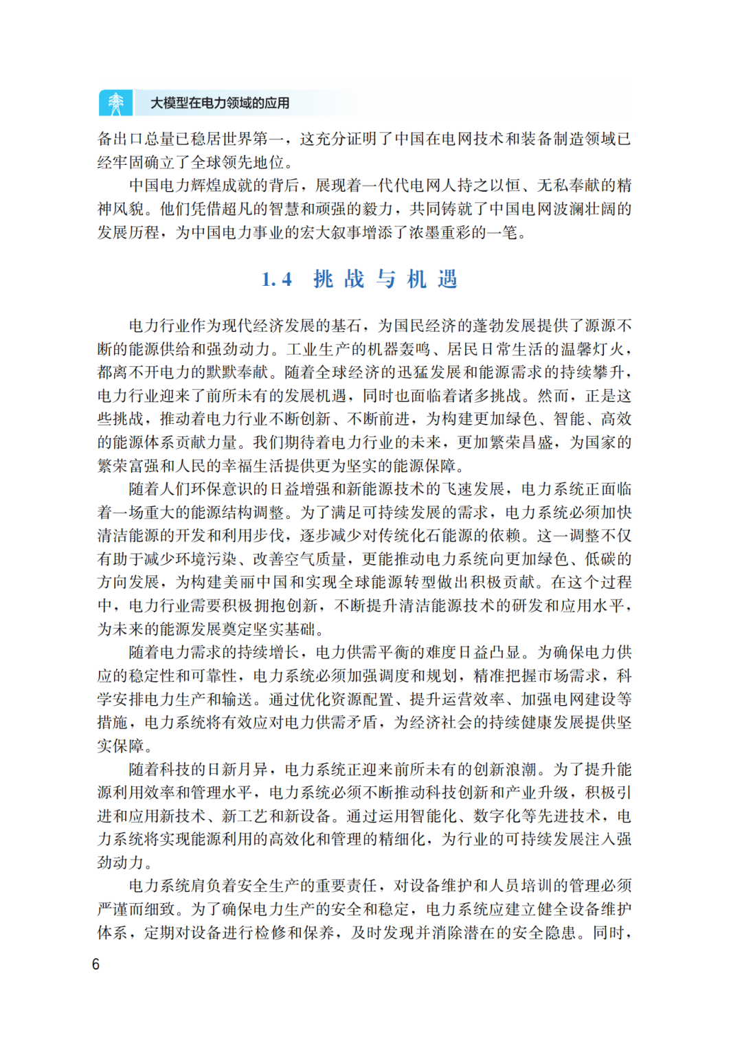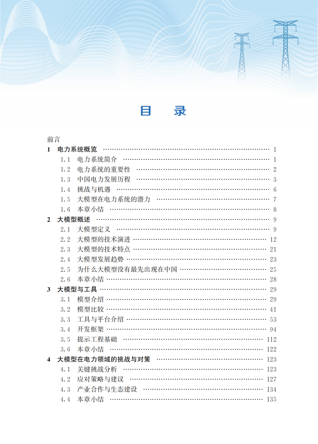 本书主要介绍大模型技术的基本原理、发展历程及其发展趋势;国内开源大模型环境搭建、特性研究和实例Demo,以及商业大模型的使用对比(ChatGLM2-6B、ChatGLM3-6B、Qwen、Baichuan);大模型在电网运行优化、故障诊断等方面的具体应用案例;电力市场需求预测及电力系统规划中的应用;基于大模型的电力领域创新解决方案;每个案例都包括:背景介绍、实验方法、实验结果与分析、电网智能化发展的趋势及挑战。最后还有技术展望以及未来研究方向。