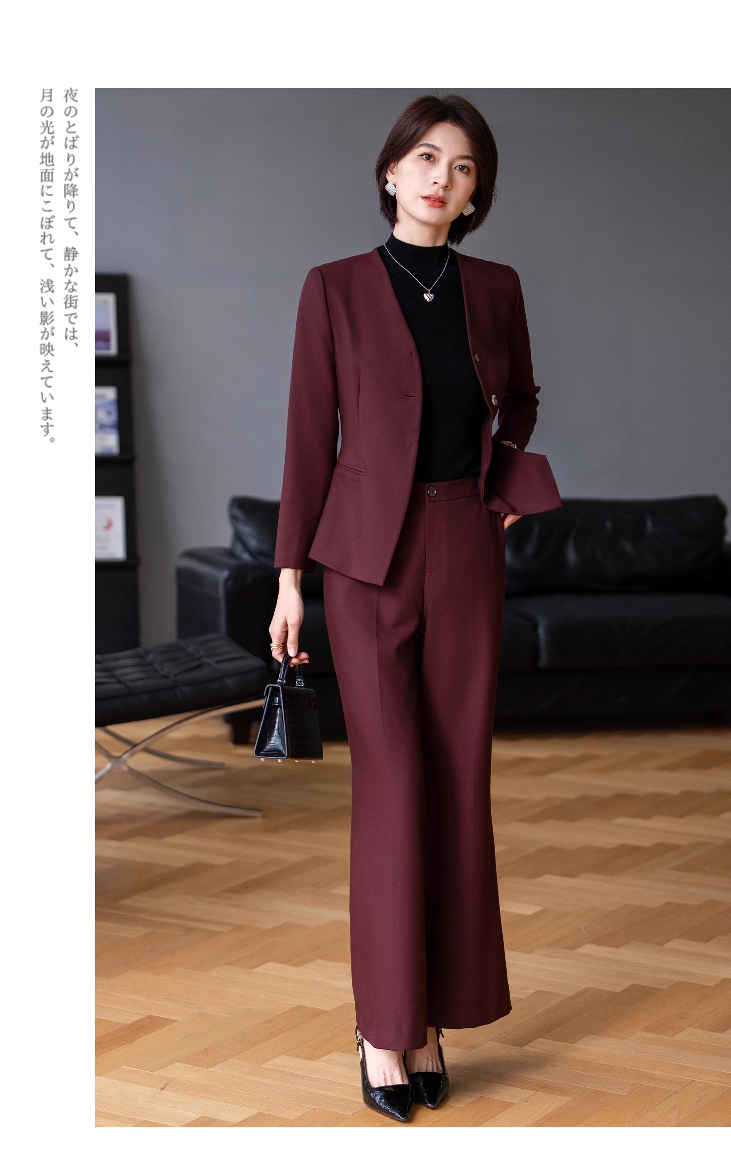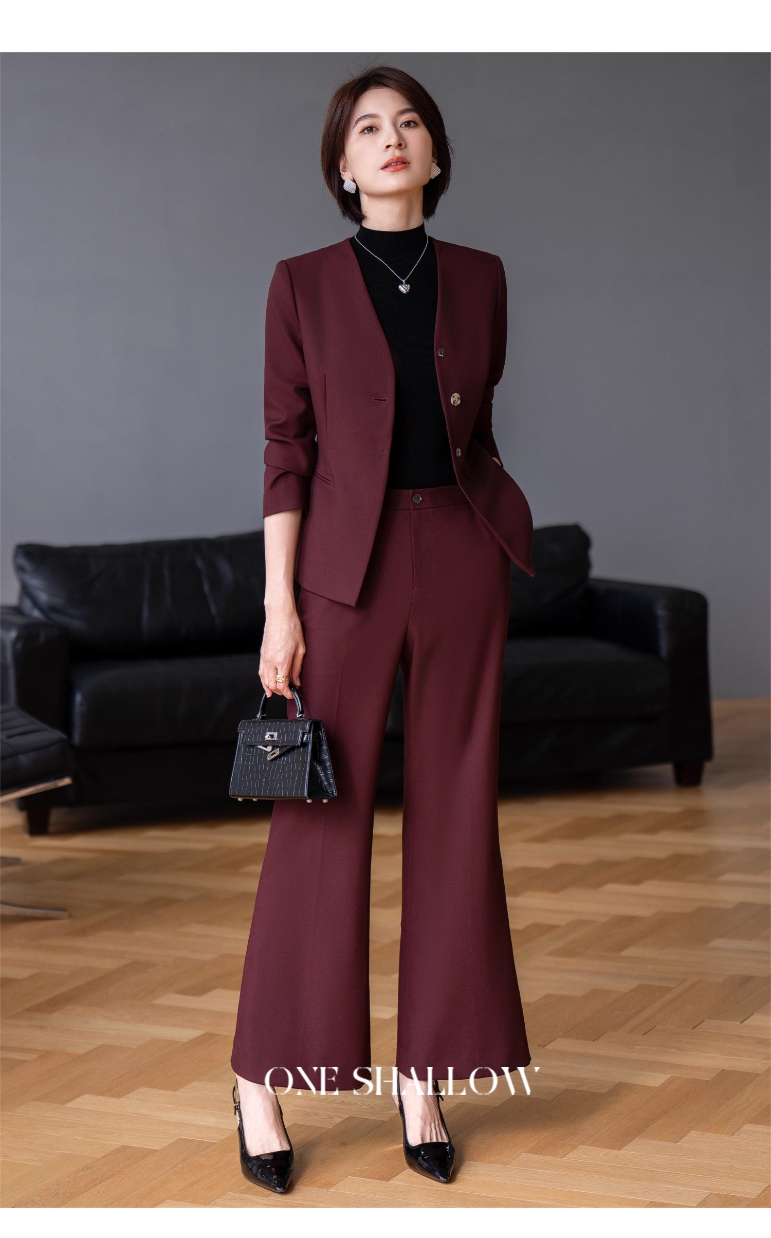 深 V 领的西装上衣,弱化了职场的严肃感,增添了几分女性的柔美与性感;微喇长裤的版型,拉长腿部线条,轻松打造 “三七分” 黄金比例身材。
