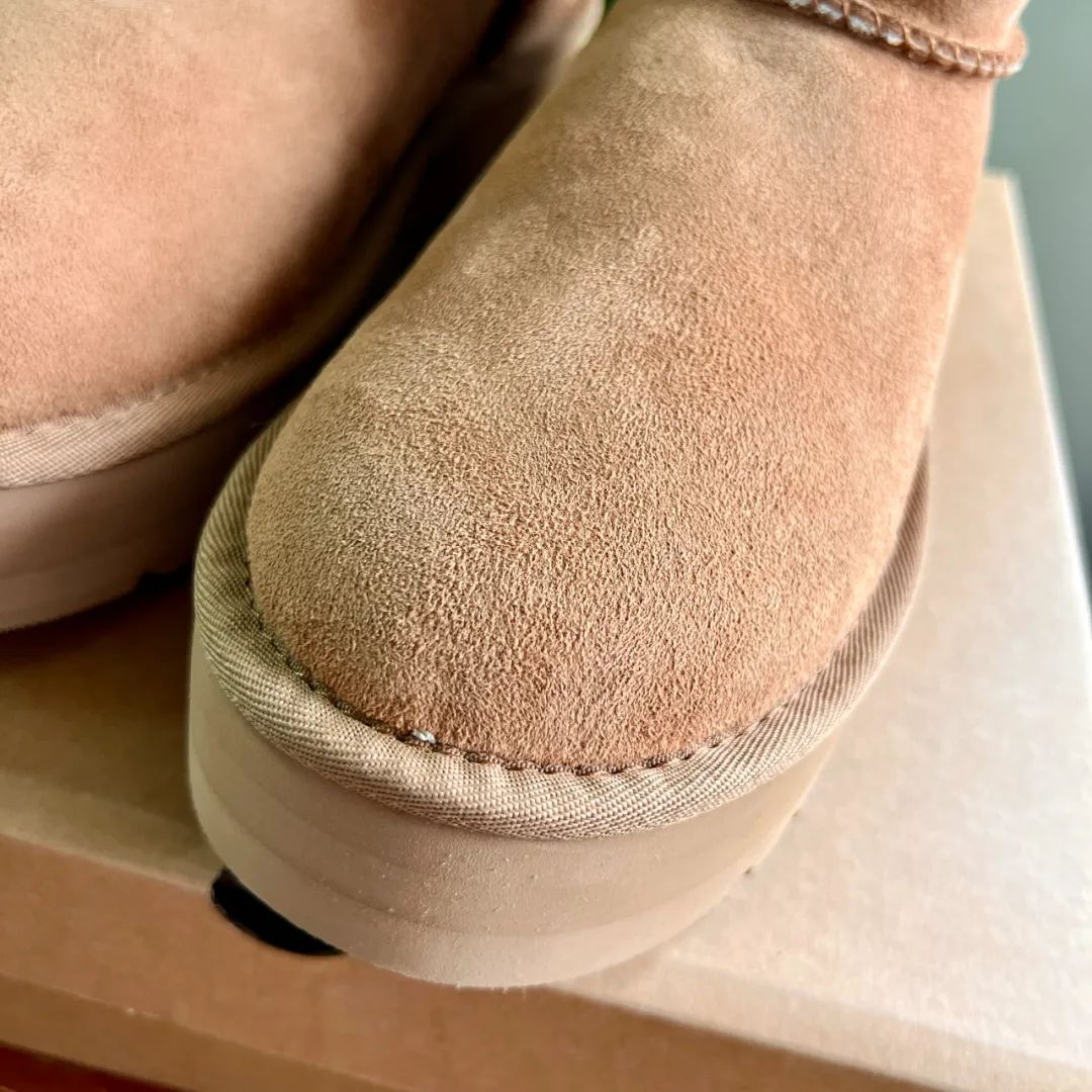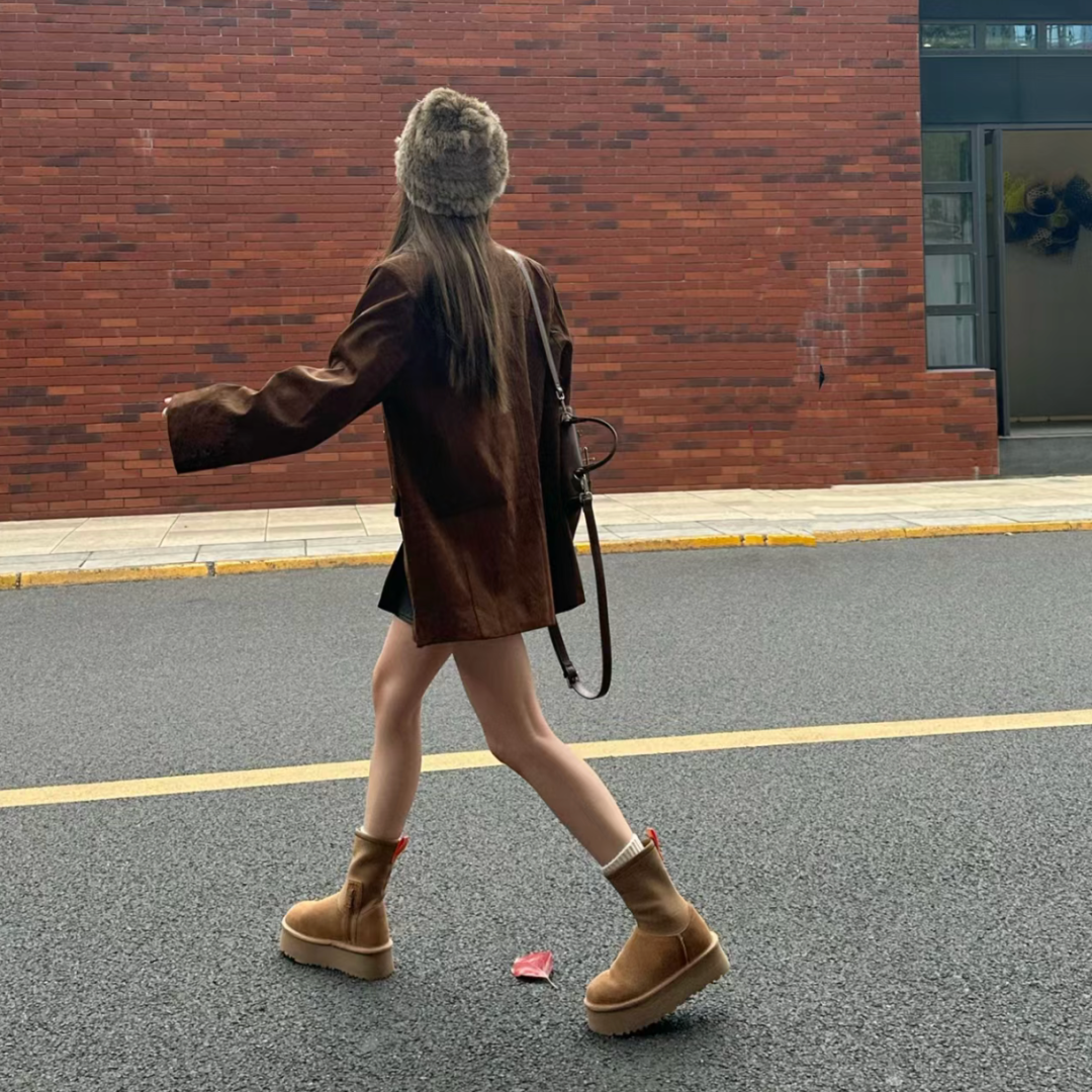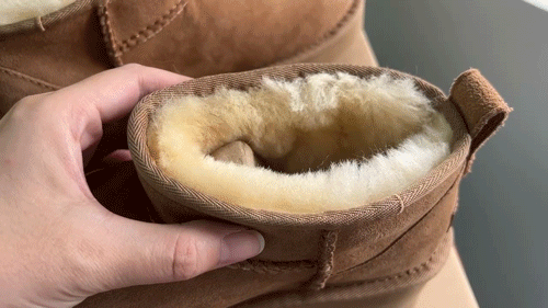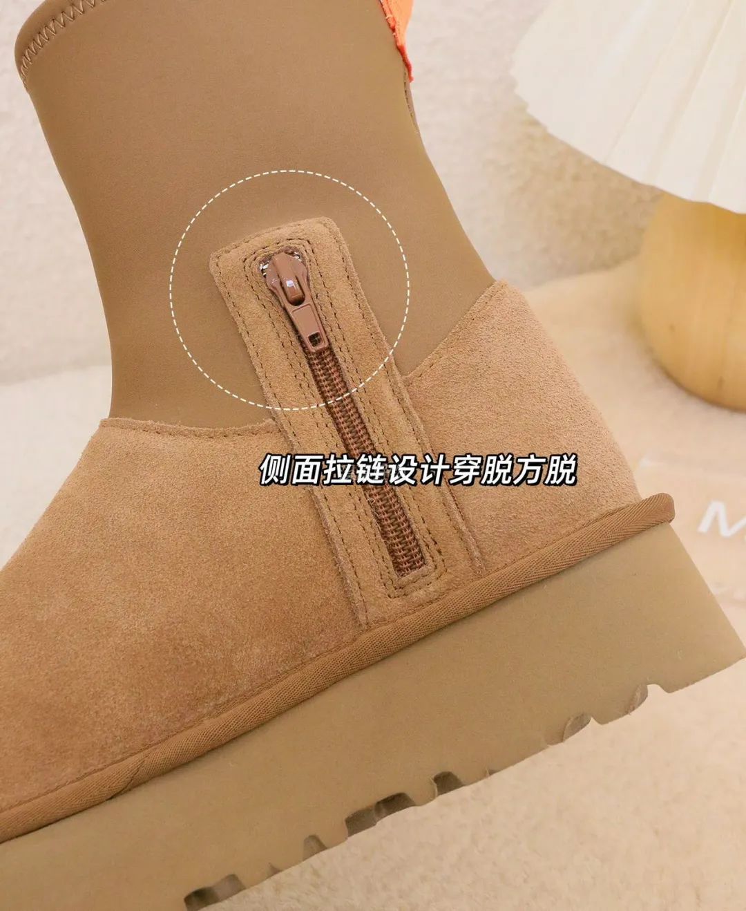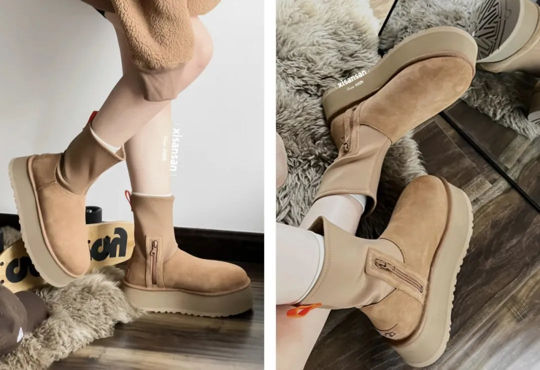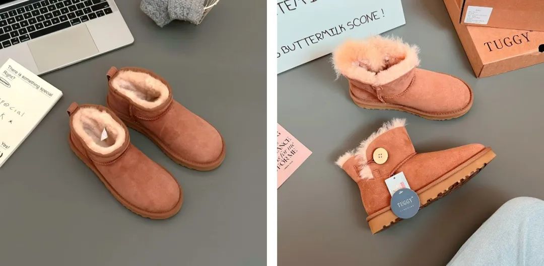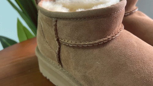 除了内里羊皮毛一体之外,隆丰雪地靴的鞋面用的还是头层牛返绒面料!(市面上很多雪地靴都是用二层皮,鞋型薄软软塌塌容易变形)强度更好,属于非常高档的面料了,一般只有大牌鞋才能看到。防泼水功能也很优秀,哪怕是直接把水泼在表面,也是迅速流掉。你试想一下,冬天下雨或者下雪的时候,穿着这双雪地靴,保暖又防水。即使踩到水坑,也不用担心靴子会湿。 这家雪地靴的每个制作环节都经过严格把控,从选皮、裁切到缝线、定型,要经过二十多道程序。精细平整的车缝线,是每英寸固定的针数,边距很均匀,线路松紧适度,不会有浮线、断线和跳针。后跟还做了加强支撑,牛皮材质给鞋子定型,看上去就很有质感。轻便、柔软有弹力,踩上去一弹一弹的,走远路也不累脚,-40℃的天气穿也不会断底!!!鞋底还辅以抓地纹路设计,增大摩擦力,冰冻路上走路超稳固。不仅如此,今天谈下来的雪地靴,价格真比想象中便宜太多了…… 一样羊皮毛一体靴,U*G同厂出品,但大牌价格至少1000+。6双实穿、好看、百搭、羊皮毛一体的雪地靴,推文价179起!除了铅笔靴之外,其余款式价格都在200上下。 整只脚都裹得稳稳当当的,脚踝还包裹一圈羊毛,太可爱啦~和经典的雪地靴和经典的雪地靴不同,它的鞋型更倾向于半拖一脚蹬,穿脱方便舒适,是很多懒癌星人的心头好。大喜庆最大的特点就是,在靴口处设计了一圈厚厚的翻毛,上脚超可爱的。尤其对于小个子的女生来说,这种短筒雪地靴是你最好的选择。搭配小黑裤、九分牛仔裤或是短裤,分分钟增高5公分~这个款式还推出了一个超火的厚底版(大概8CM的厚度),名副其实的「矮子乐」。可别小看这点改动,时尚秀场可都在暗戳戳提示:厚底才是王道。穿大喇叭裤的时候,裤底悄悄藏一双厚底鞋,暗戳戳增高也没人知道。虽然底部很厚,但是一点儿都不笨重,啥风格都能驾驭的很好~