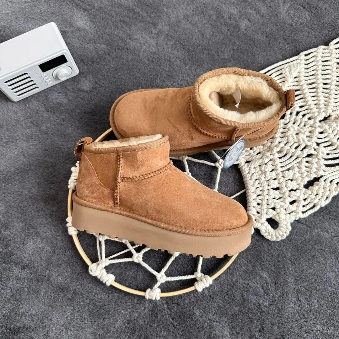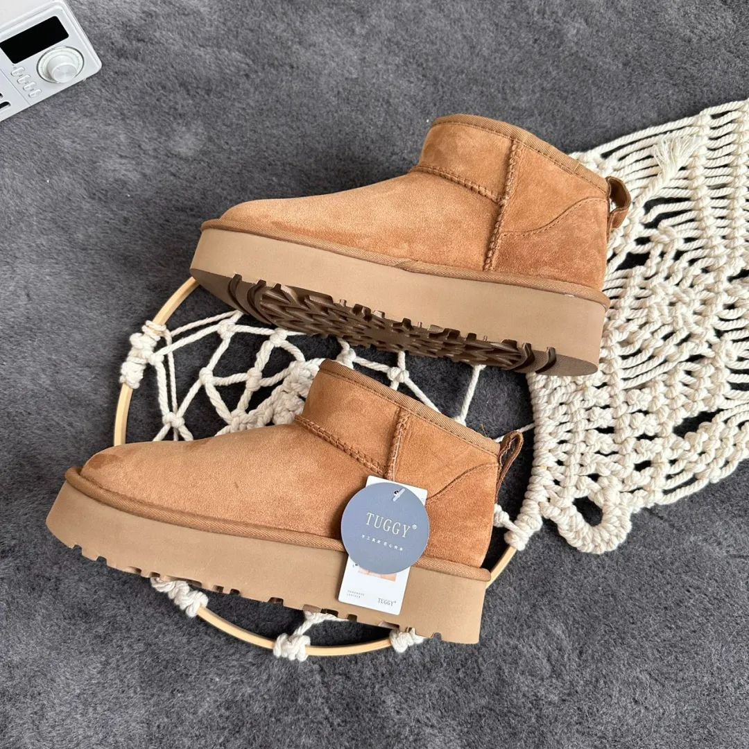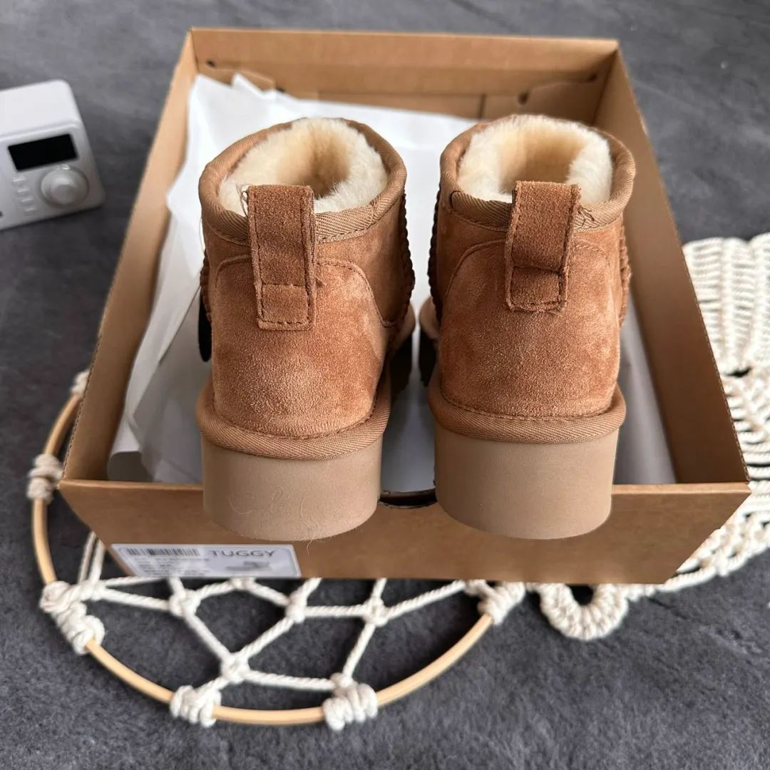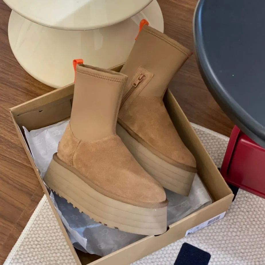 除了内里羊皮毛一体之外,隆丰雪地靴的鞋面用的还是头层牛返绒面料!(市面上很多雪地靴都是用二层皮,鞋型薄软软塌塌容易变形)强度更好,属于非常高档的面料了,一般只有大牌鞋才能看到。防泼水功能也很优秀,哪怕是直接把水泼在表面,也是迅速流掉。你试想一下,冬天下雨或者下雪的时候,穿着这双雪地靴,保暖又防水。即使踩到水坑,也不用担心靴子会湿。 这家雪地靴的每个制作环节都经过严格把控,从选皮、裁切到缝线、定型,要经过二十多道程序。精细平整的车缝线,是每英寸固定的针数,边距很均匀,线路松紧适度,不会有浮线、断线和跳针。后跟还做了加强支撑,牛皮材质给鞋子定型,看上去就很有质感。轻便、柔软有弹力,踩上去一弹一弹的,走远路也不累脚,-40℃的天气穿也不会断底!!!鞋底还辅以抓地纹路设计,增大摩擦力,冰冻路上走路超稳固。不仅如此,今天谈下来的雪地靴,价格真比想象中便宜太多了…… 一样羊皮毛一体靴,U*G同厂出品,但大牌价格至少1000+。6双实穿、好看、百搭、羊皮毛一体的雪地靴,推文价179起!除了铅笔靴之外,其余款式价格都在200上下。 整只脚都裹得稳稳当当的,脚踝还包裹一圈羊毛,太可爱啦~和经典的雪地靴和经典的雪地靴不同,它的鞋型更倾向于半拖一脚蹬,穿脱方便舒适,是很多懒癌星人的心头好。大喜庆最大的特点就是,在靴口处设计了一圈厚厚的翻毛,上脚超可爱的。尤其对于小个子的女生来说,这种短筒雪地靴是你最好的选择。搭配小黑裤、九分牛仔裤或是短裤,分分钟增高5公分~这个款式还推出了一个超火的厚底版(大概8CM的厚度),名副其实的「矮子乐」。可别小看这点改动,时尚秀场可都在暗戳戳提示:厚底才是王道。穿大喇叭裤的时候,裤底悄悄藏一双厚底鞋,暗戳戳增高也没人知道。虽然底部很厚,但是一点儿都不笨重,啥风格都能驾驭的很好~