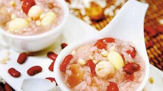 先将芡实,红枣,花生仁用清水浸泡30分钟后,放入锅中煮5分钟再放入粳米,煮至粥稠即可食用。