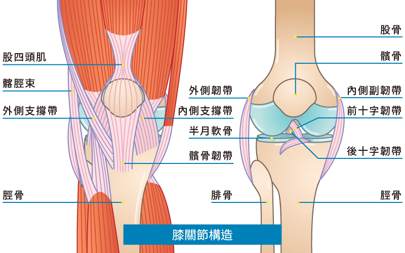 解剖结构上,髌骨位于膝关节前方,由股四头肌肌腱在上方固定,髌骨韧带在下方连接至胫骨。当这个系统失衡时,就会出现髌骨周围的疼痛、肿胀、摩擦音等症状。