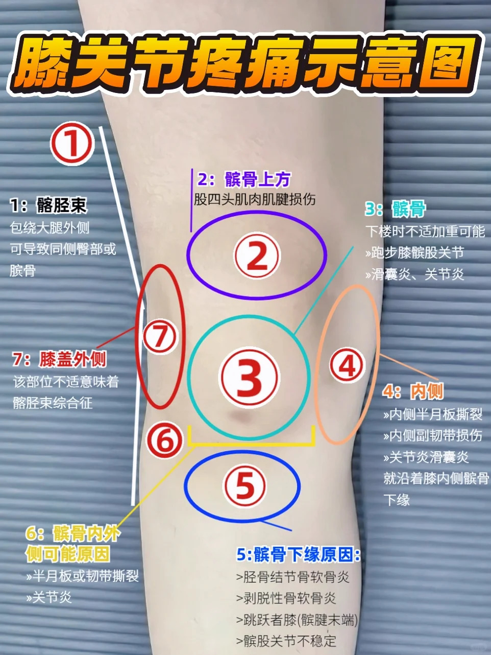 跑步膝髌骨轨迹异常,反复摩擦软骨,膝盖正前方/髌骨周围,诱因为股四头肌失衡、跑姿内扣、跑量骤增。