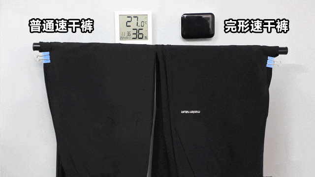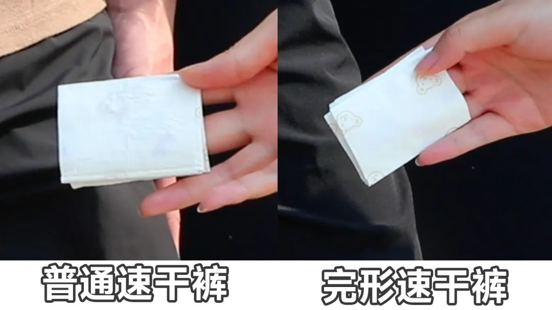 完型速干裤只用了短短3分钟已经完全干透!另一条速干裤用纸巾擦拭,还是湿的~。