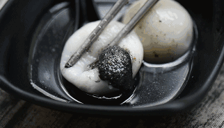宁波人的汤团,全称该是「猪油汤圆」,猪板油剔筋、膜、斩碎,混着芝麻粉揉透,咬一口馅儿才有迫不及待流出来的香润。