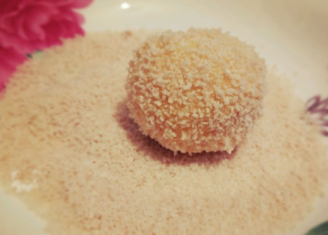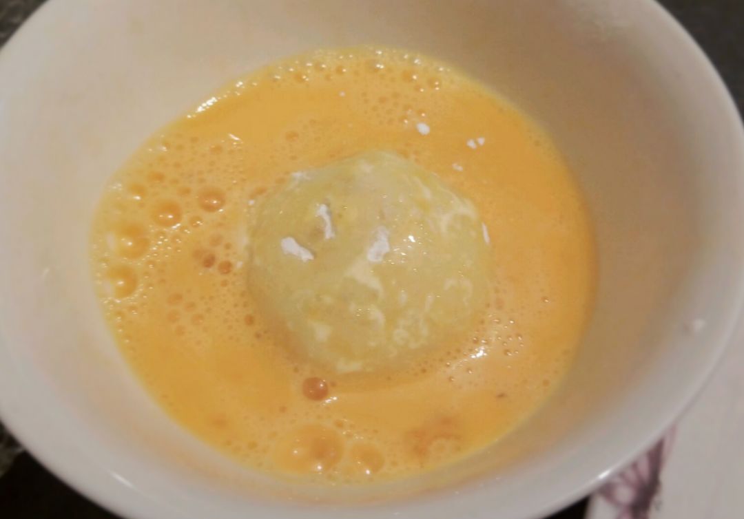 2、把土豆泥球在蛋液中蘸一下,再均匀的蘸满馒头渣;