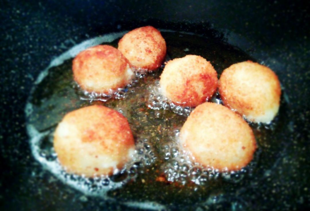 4、炸制过程中,要保持低油温,大概3~4成热,如果油温热土豆丸子就硬了。