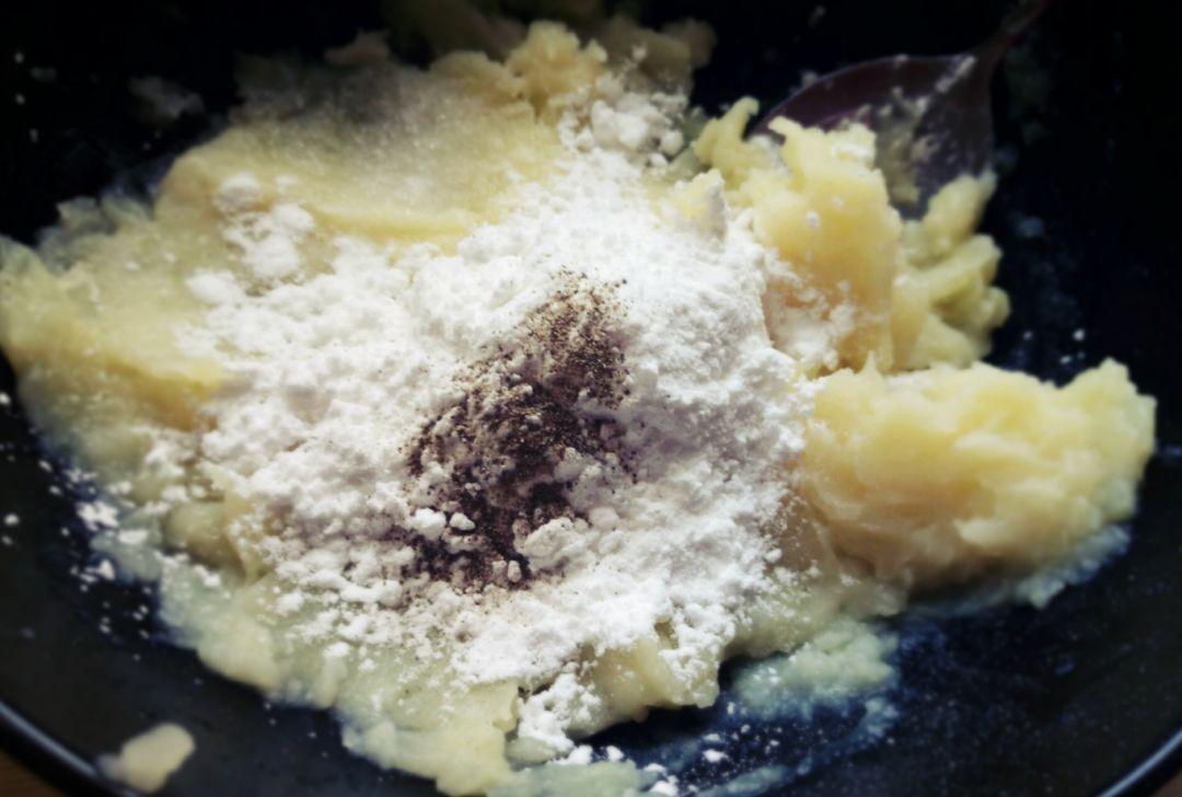 2、土豆蒸熟以后,要在没有冷却之前撵成土豆泥;