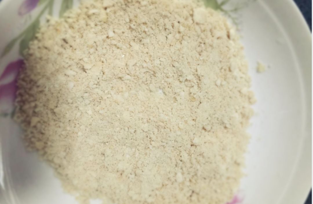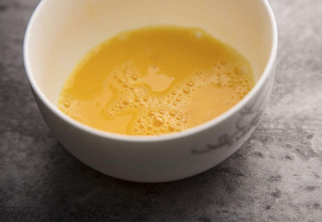3、把馒头去皮,切成小丁,撵成馒头渣,也可用面包屑代替;