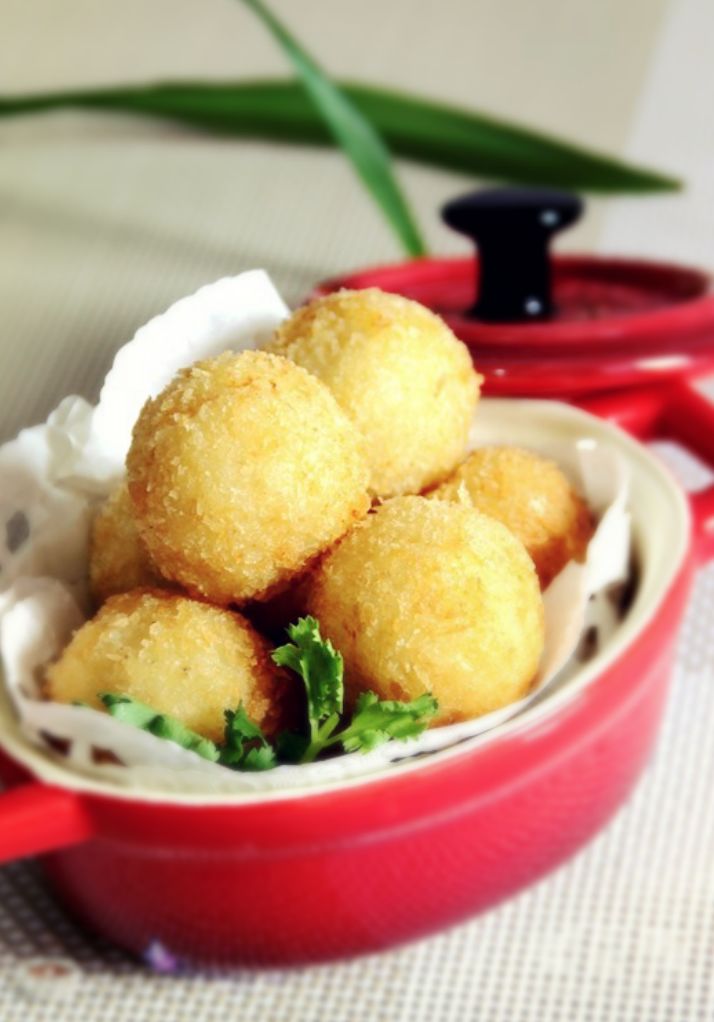 1、把调好的土豆泥挤成一个个小球,大概鸡蛋黄大小;