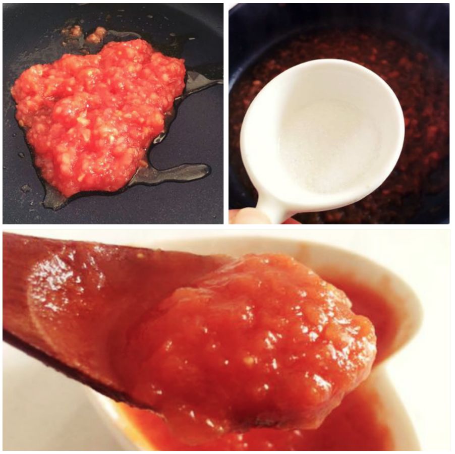 4、锅中留底油,放入番茄沙司4勺,1勺白糖,2勺苹果醋,翻炒到粘稠,关火,浇上1小勺明油,翻炒均匀;