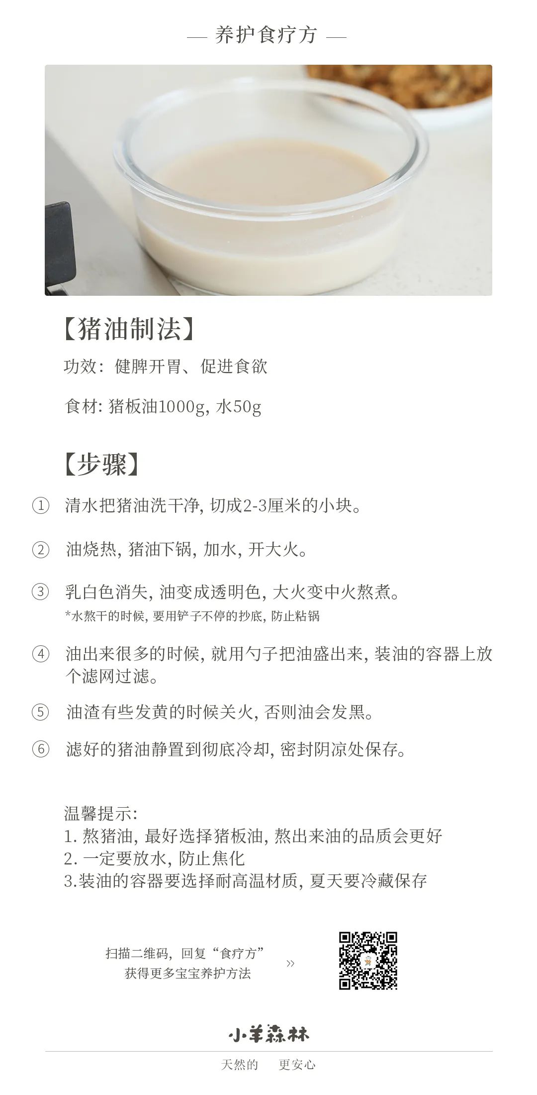 猪油就是一味很好的食材,用来炒菜有特殊的香气,可以促进食欲,而且性质偏润,比起花椒、八角等香料来还不容易上火。