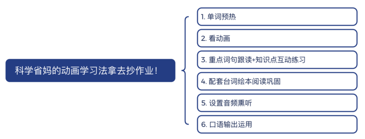 接下来我们按照语言学习方法和这套互动课程内容设计,给大家准备了一套科学省妈效果立竿见影的6步走动画学习法——跟着这个六步走,听说积累和开口应用的效果一定会惊艳你!