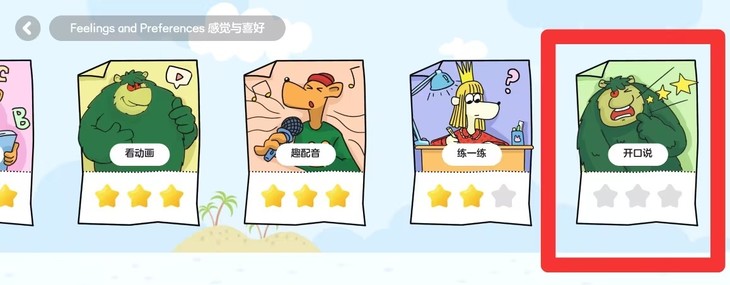 在speak环节制作了专门的小动画引导回顾该课时涉及的重点句式,然后向小朋友提出问题,小朋友们只要根据提问进行回答上传作品就行,降低了输出的难度~