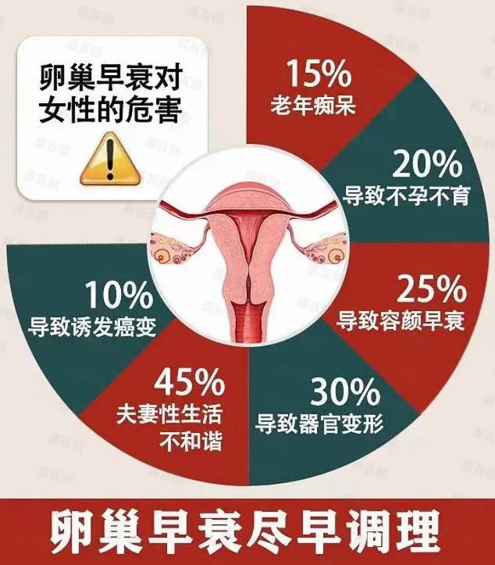 卵巢早衰是女性生殖系统的一种疾病,会导致月经不规律或停经,子宫内膜变薄,卵子质量下降,影响生和生殖健康。所以一旦出现卵巢早衰约早调理越好,别等到卵巢都退休了才知道他的重要性,要知道世上可没有后悔药吃。