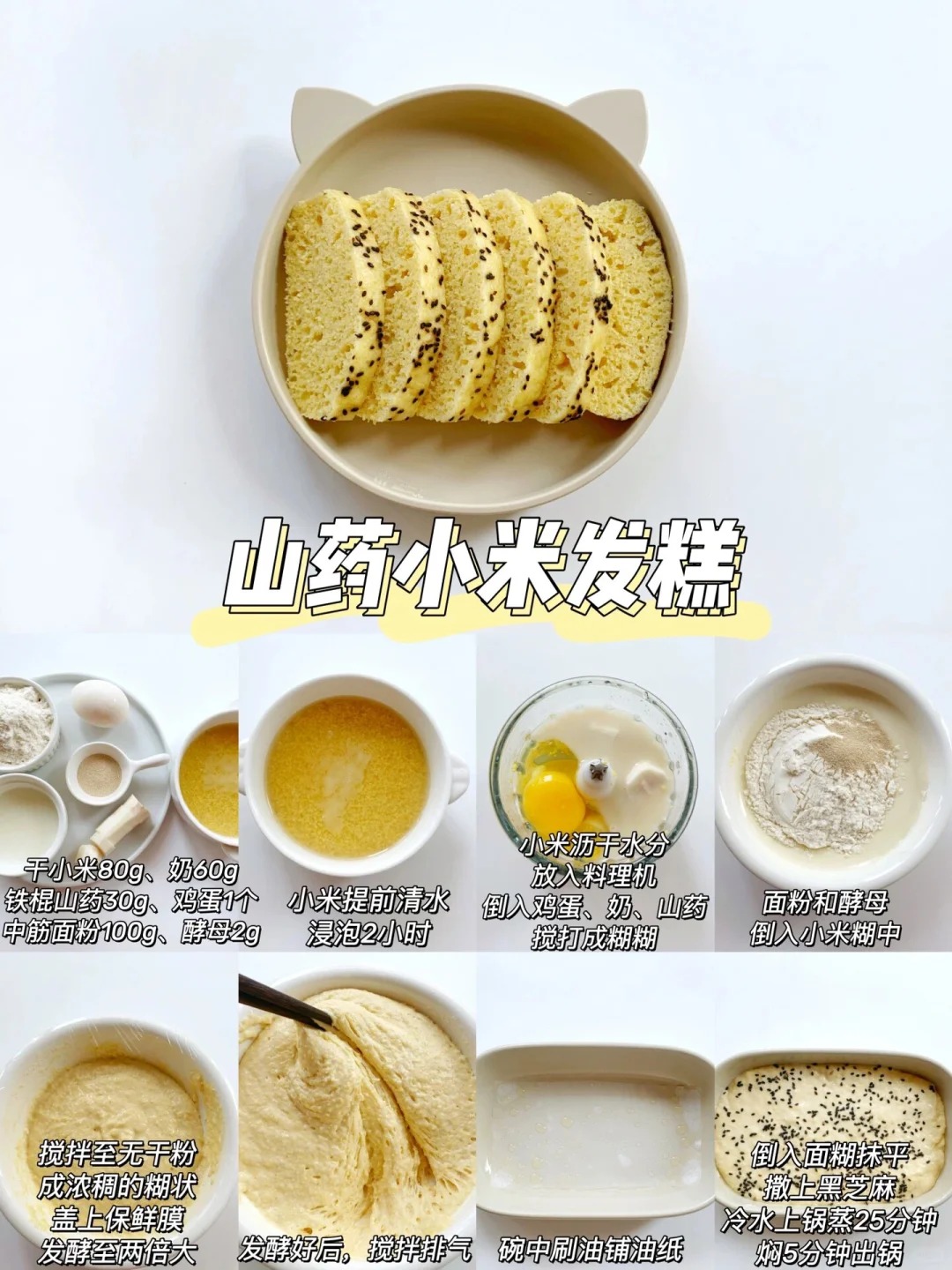 食材准备:干小米80g、铁棍山药30g、鸡蛋1个、配方奶60g、中筋面粉100g、酵母2g、黑芝麻