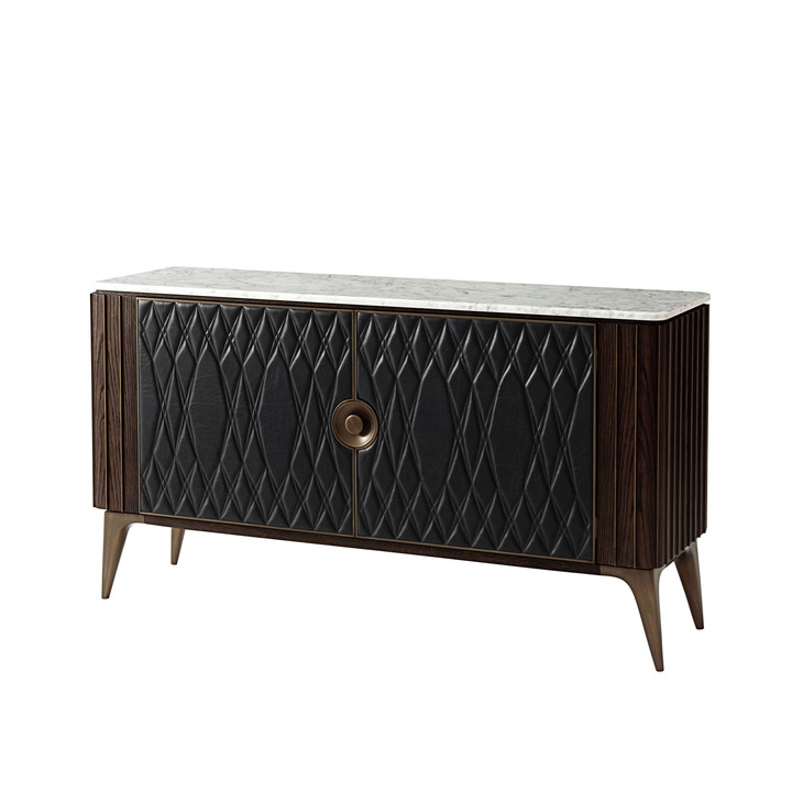 这款边柜是经典的梁志天先生设计风格,采用橡木作为主材打造,牛皮柜门饰面,大理石台面搭配不锈钢配件,营造现代奢华风格。