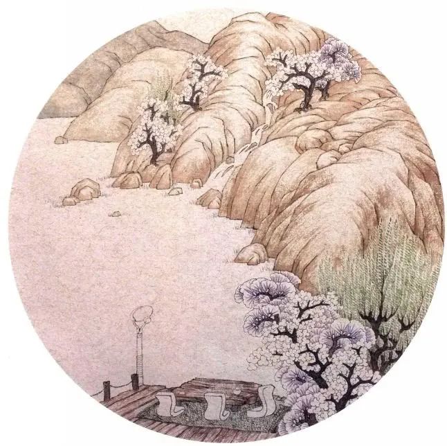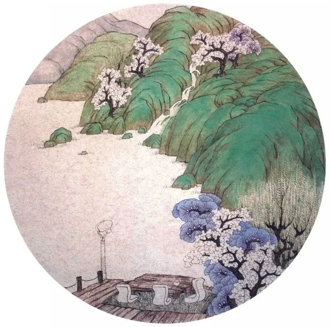 第三步:山石从上向下先罩染一遍石绿,之后再罩染一遍石青,染色时注意石色随景深的变化而由深到浅的变化。扇形树叶罩染石青三遍,以达到一定的色彩饱和度又能透出所分染的紫色为宜。