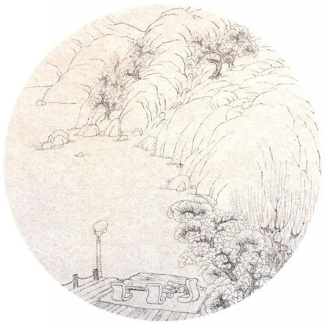 第一步:构图。在勾画山石树木的轮廓时用笔要收敛,线条细劲,只是稍微强调粗糙树干与花、树叶的线条对比,以及近景观景台上用不同的线条表现矮桌和沙发的不同质感。