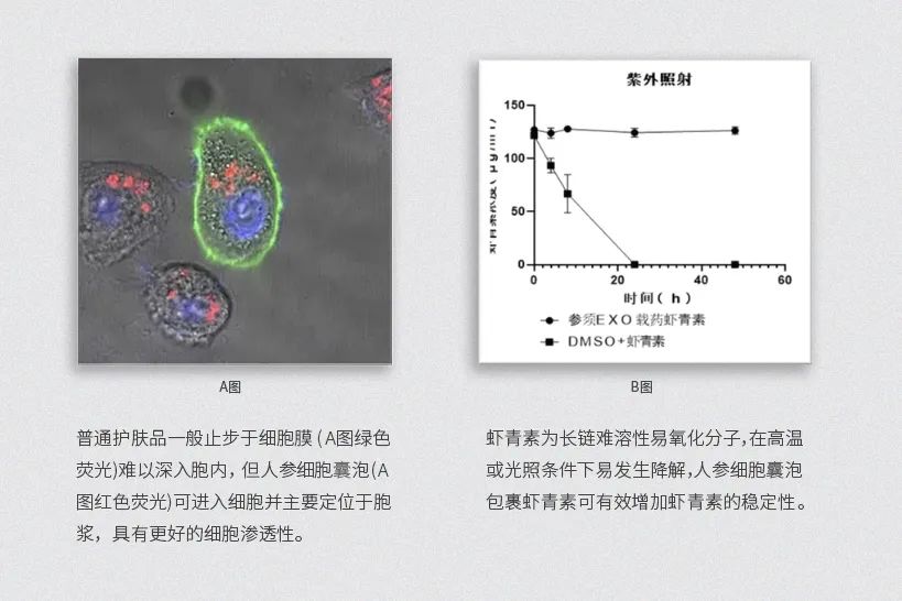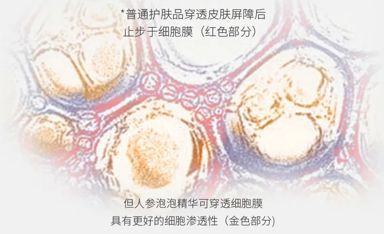 采用世界领先的差速离心技术,从特等人参根中提取人参细胞外囊泡,其脂质双层空心结构具有优良的生物相容性,通过跨细胞途径和细胞间途径,人参外囊泡包裹着虾青素可以很好地与皮肤脂质融合,轻松抵达皮下0.3mm,进而扩散、释放活性抗衰成分。根据研究数据显示,人参囊泡可以提升8倍渗透力,为抗衰护肤提供深层透皮、靶向递送的独特功效。