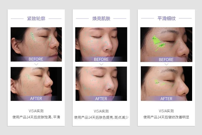 上市之前,她境·人参泡泡精华开展了1500人的大面积盲测,采用专业皮肤检测仪器VISIA实测,每日使用2次,14天后,使用者面部肉眼可见得焕亮紧致,其中,紧致度平均提升10.5%,亮白光泽感提升21.9%,皱纹面积减少28.3%,不论是第三者观察还是自我观察,绝大多数使用者都认同以上效果。